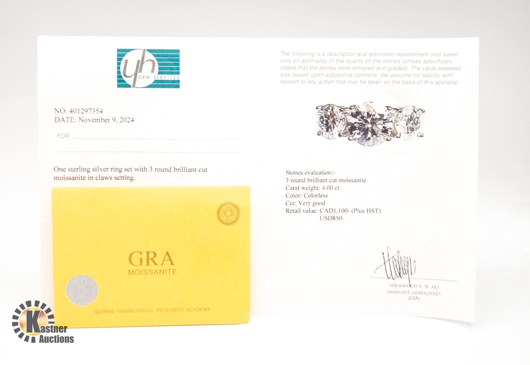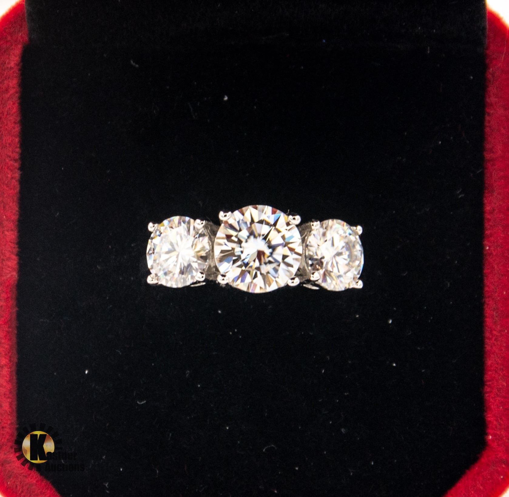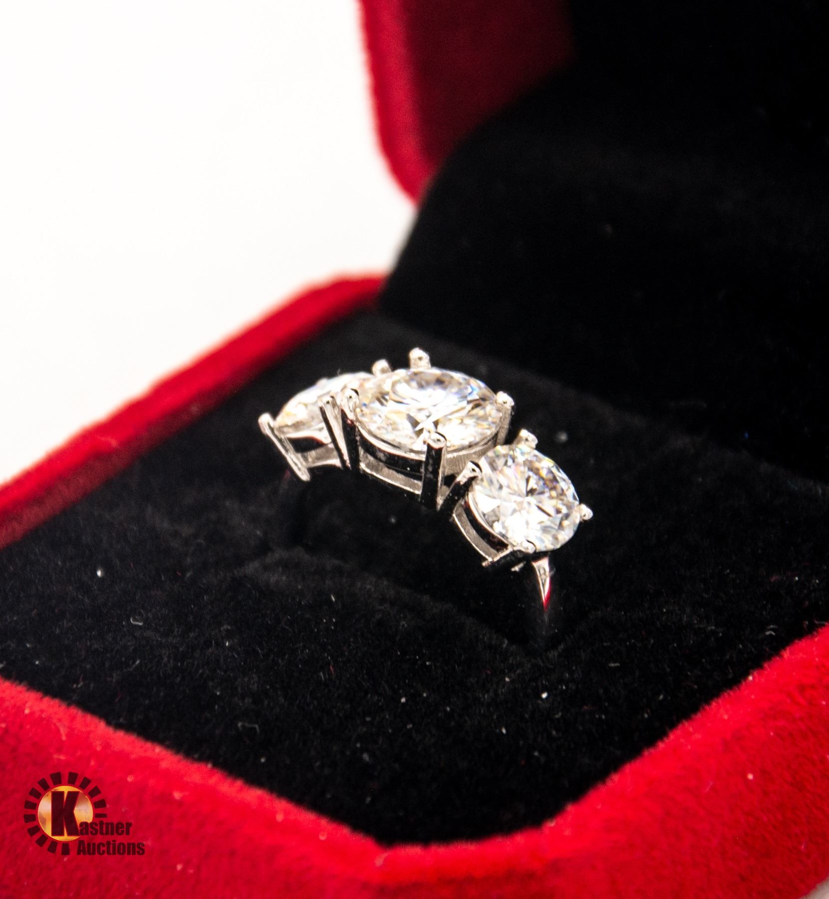 STONES VVS D COLOR WITH THE CENTER MOISSANITE WEIGHING 2.00 CT WITH 1.00 CT ON EITHER SIDE SET IN 925 SILVER RING SIZE 7 RETAIL VALUE $1,100.00
