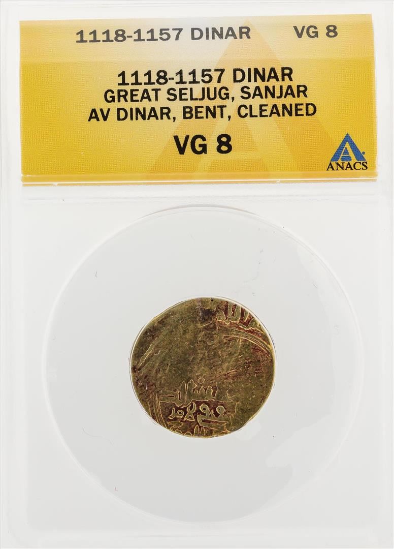 One 1118-1157 Dinar Great Seljug Sanjar AV Dinar Bent Cleaned Coin ANACS VG8. ANACS Certified.