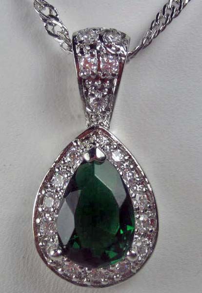 11187 - WHITE GOLD PLATED EMERALD AND WHITE TOPAZ PENDANT W/ CHAIN