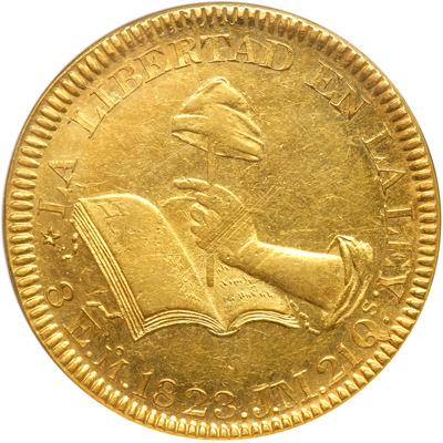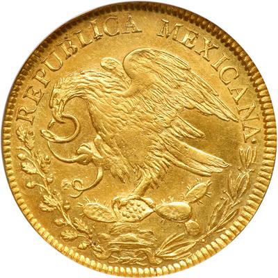 Mexico - Republic. 8 Escudos, 1823-Mo-JM. Fr-63; KM 382.2. 27.01 grams. Type II: Hooknecked-eagle, left, holding looped snake. Reverse: Hand holding Liberty Cap on staff, over open book. Faint adjustment marks at hand, otherwise centers unusually well struck up. Fields very lustrous. Very rare, particularly in this grade. NGC graded MS-62.