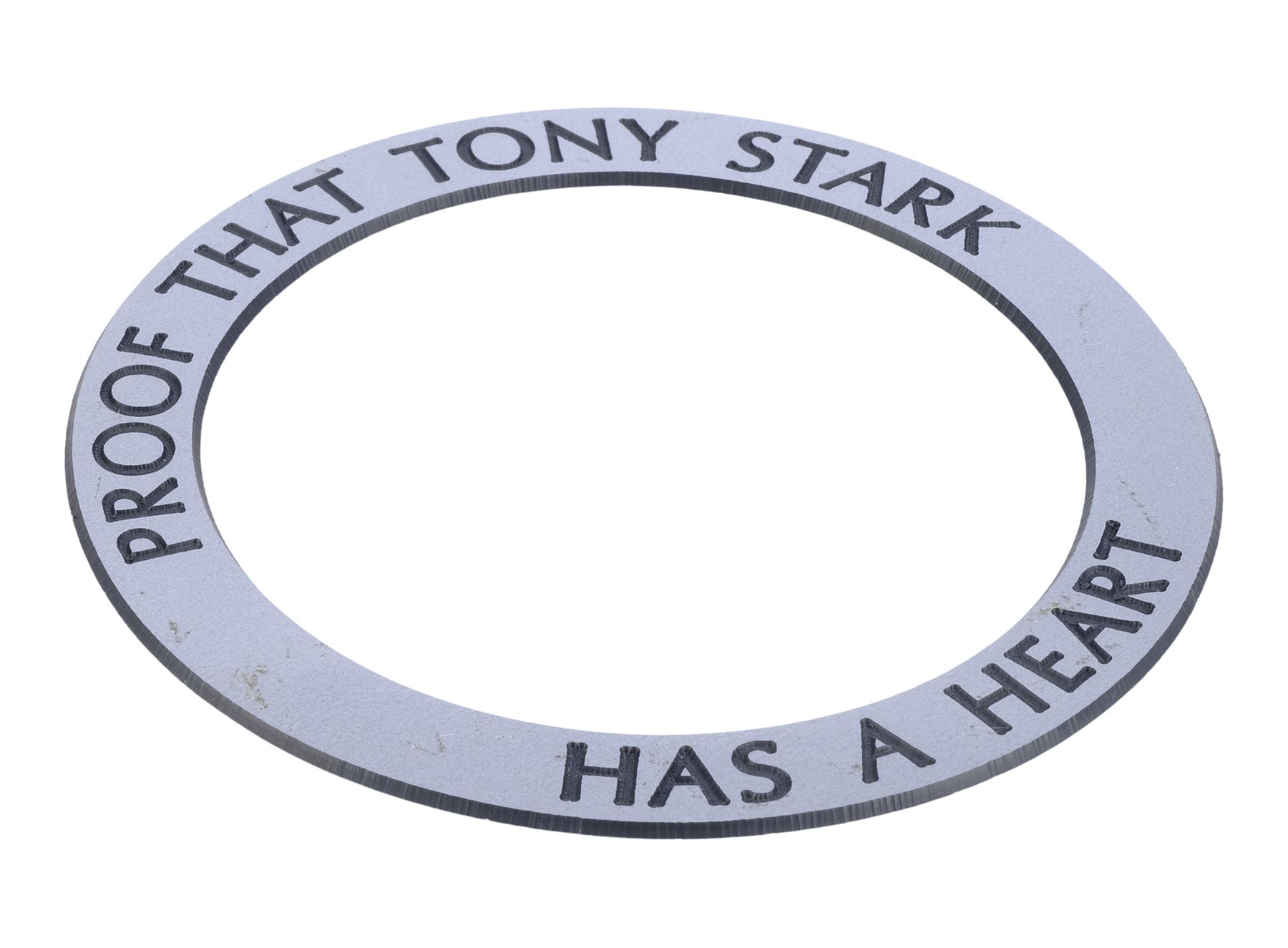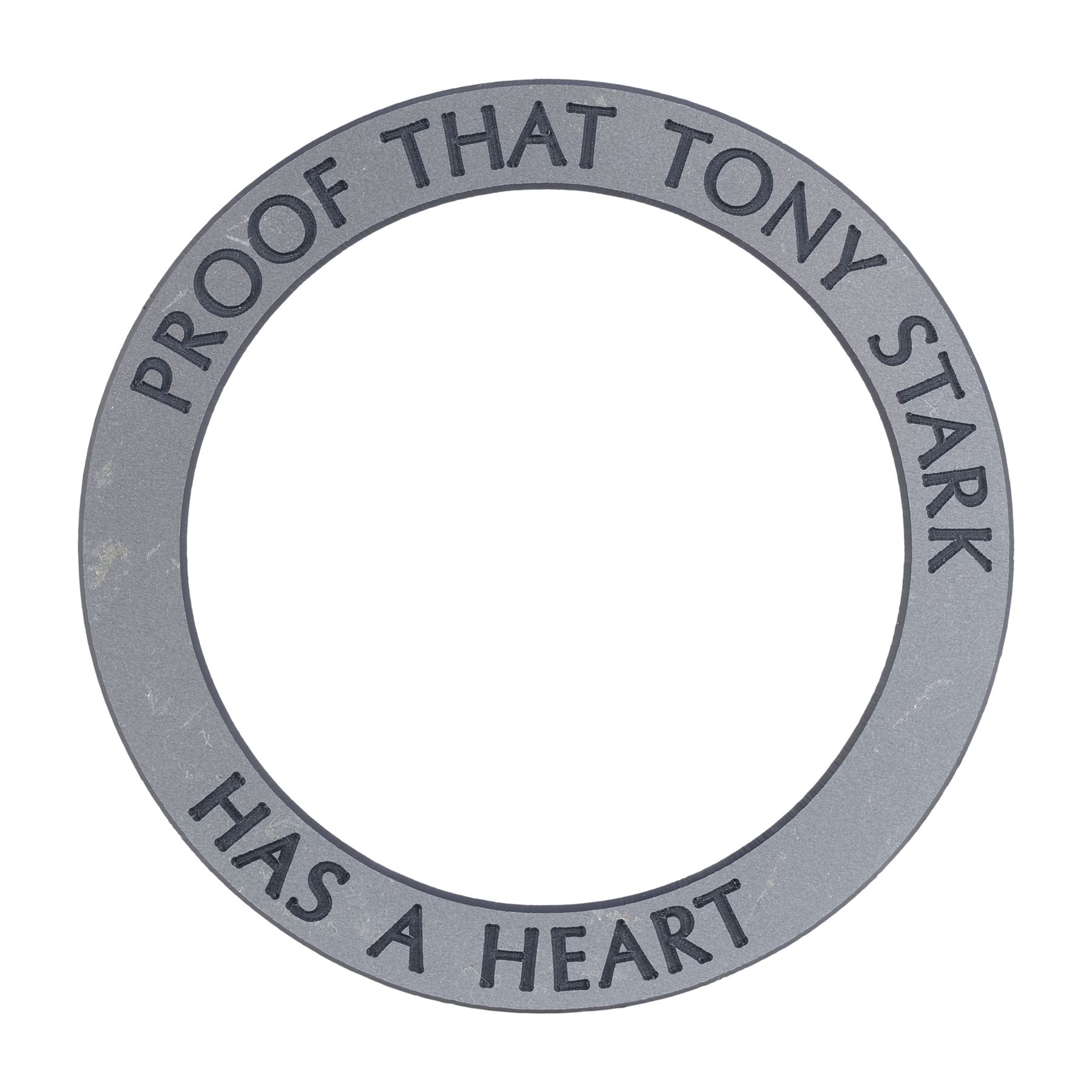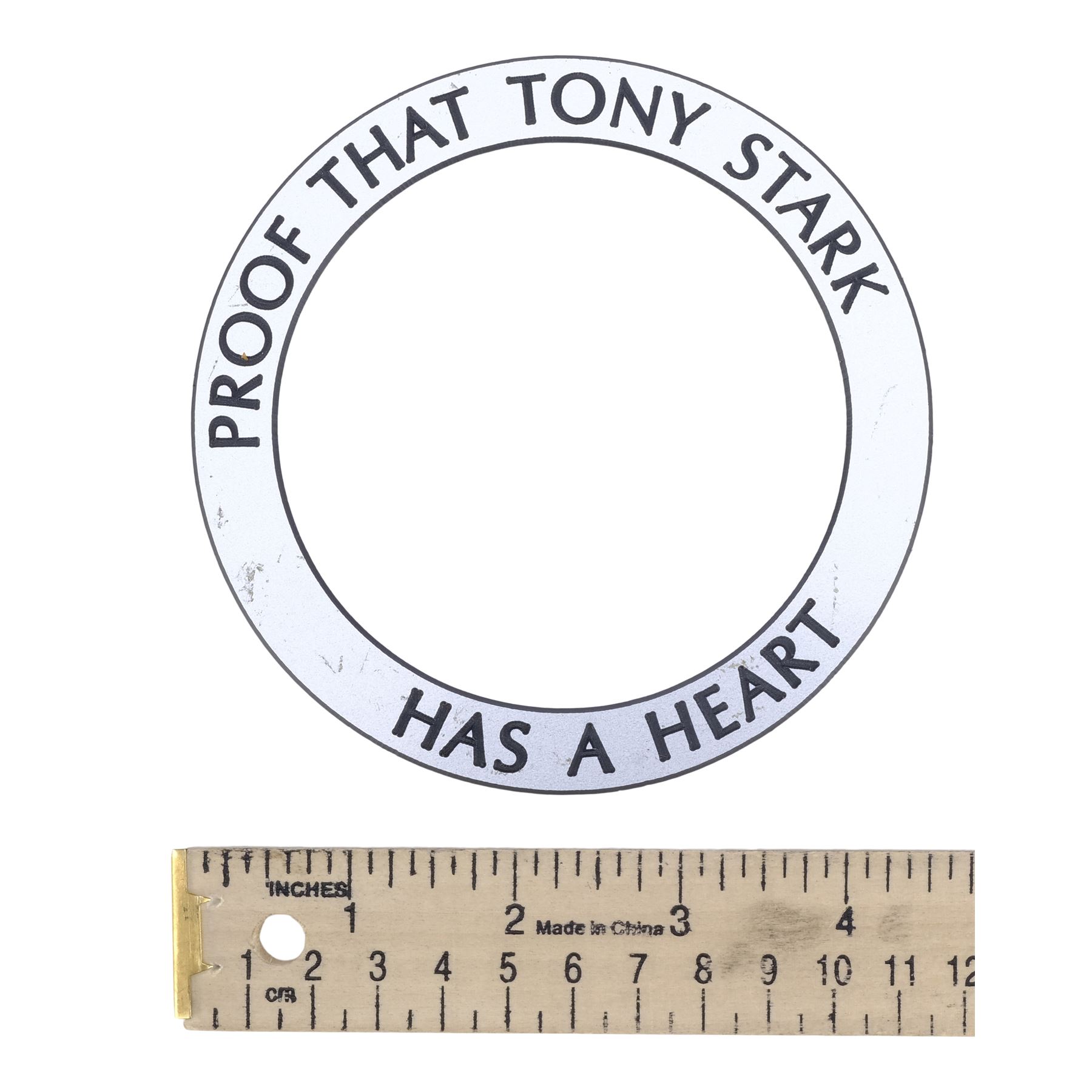 The silver-color acrylic ring displays black engraved text reading "Proof That Tony Stark Has A Heart." Unpeeled, double-sided tape on its rear allows for adherence to the node. It exhibits signs of wear, including marks and minor scratches. Dimensions: 4.5" x 4.5" x 0.25" (11.5 cm x 11.5 cm x 0.25 cm)