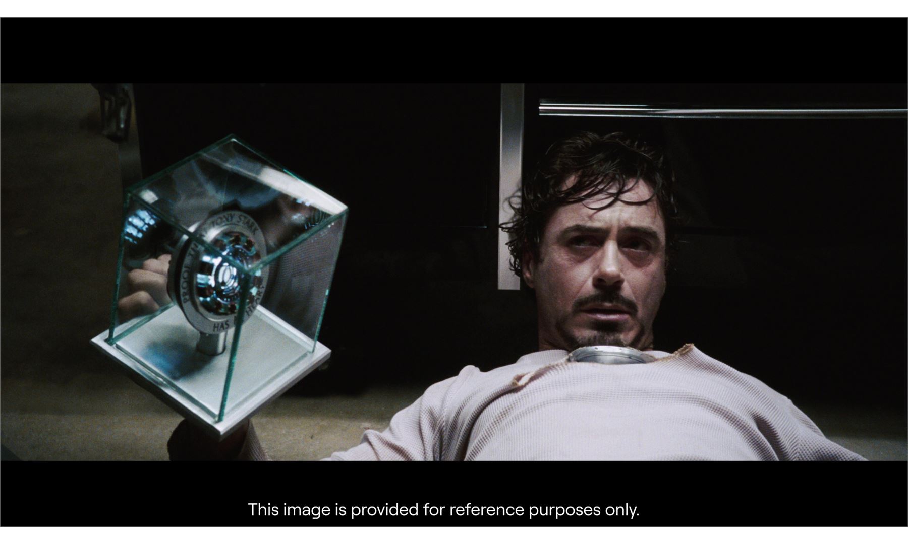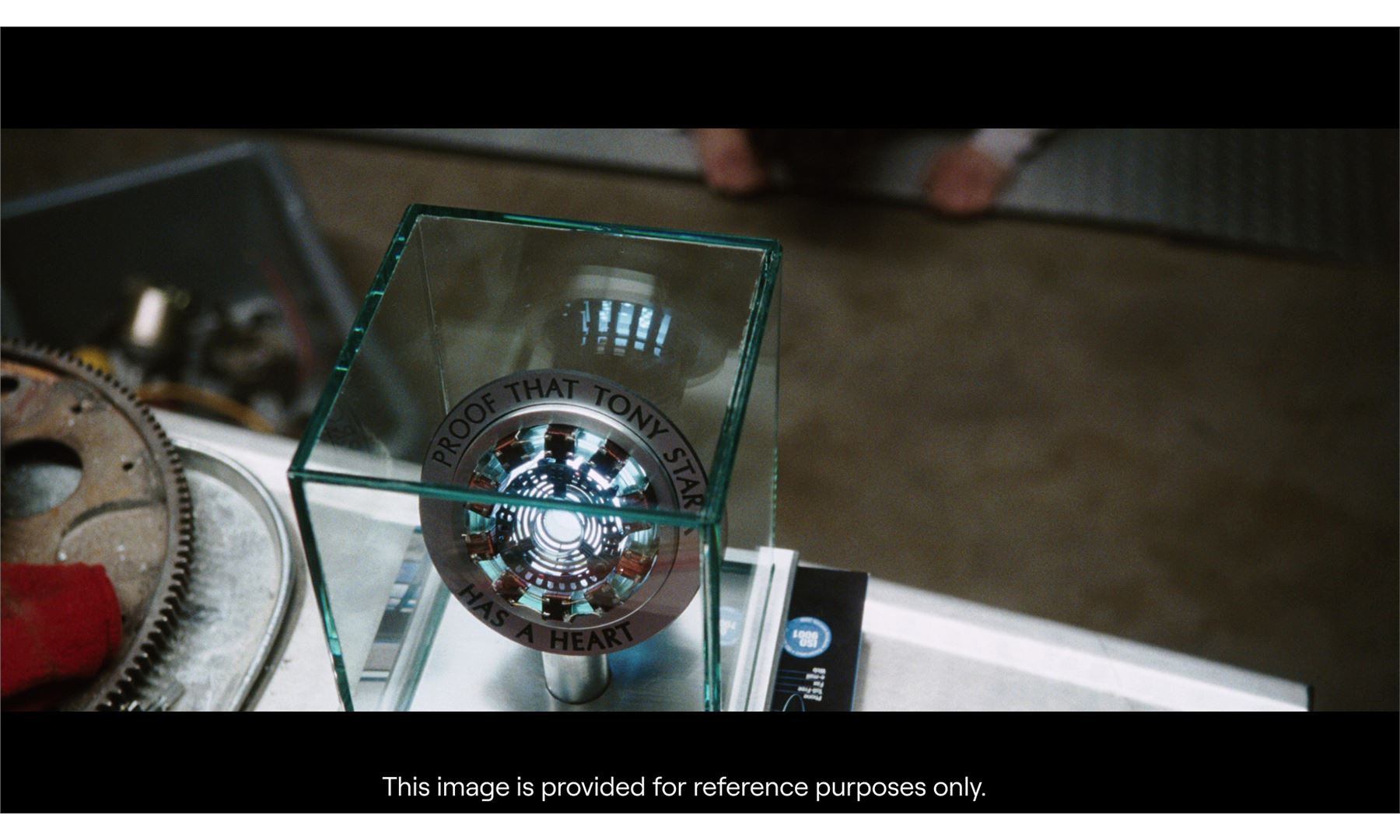 IRON MAN (2008) - Production-Made "Proof That Tony Stark Has A Heart" Display Ring - A production-made "Proof That Tony Stark Has A Heart" display ring from Jon Favreau's Iron Man. Tony Stark's (Robert Downey Jr.) first repulsor technology node was regifted to him by Pepper Potts (Gwyneth Paltrow) in a display with an engraved ring that Stark later smashed as he rushed to replace his chest piece.