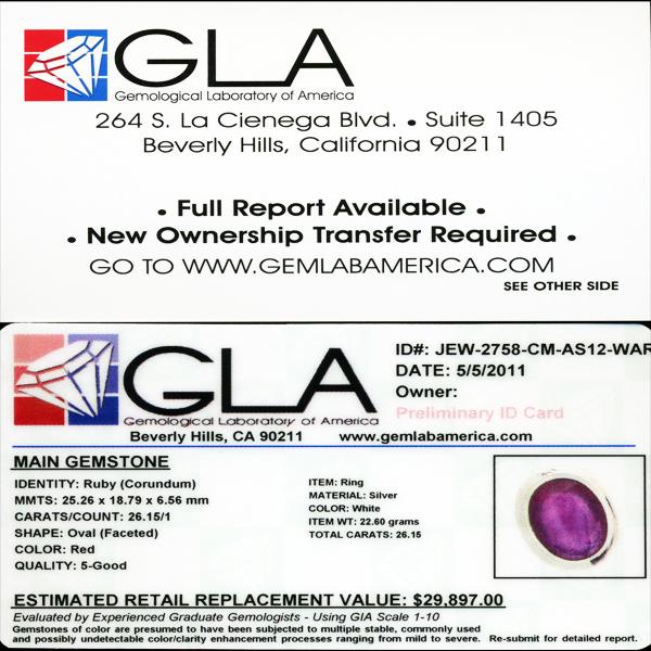 In the event that an item is listed as having an "Appraisal Estimate", this represents WAR's in-house estimate of what the item would appraise for at Gem Labs of America (GLA), Beverly Hills, CA. Actual appraisal of the item at GLA is the responsibility of the Bidder, however WAR may assist, at its discretion, in related logistics. WAR does provide the following guaranty (the "WAR 5% Loose Gem Guaranty") relative to Appraisal Estimate values of LOOSE GEMS: In the event that the GLA appraised value is not such an amount that the Bidder's winning bid is five percent (5%) or less of the GLA appraised value, then WAR, in it's discretion, will either refund such amount of the Bidder's winning bid and related charges so that the winning bid equals five percent (5%) of the GLA appraised value, or, instead issue a full refund on the item and reimburse the Bidder for the GLA appraisal fees. The Bidder may also opt to retain the item, in which case the WAR 5% Gem Guaranty shall not apply relative to the particular item.