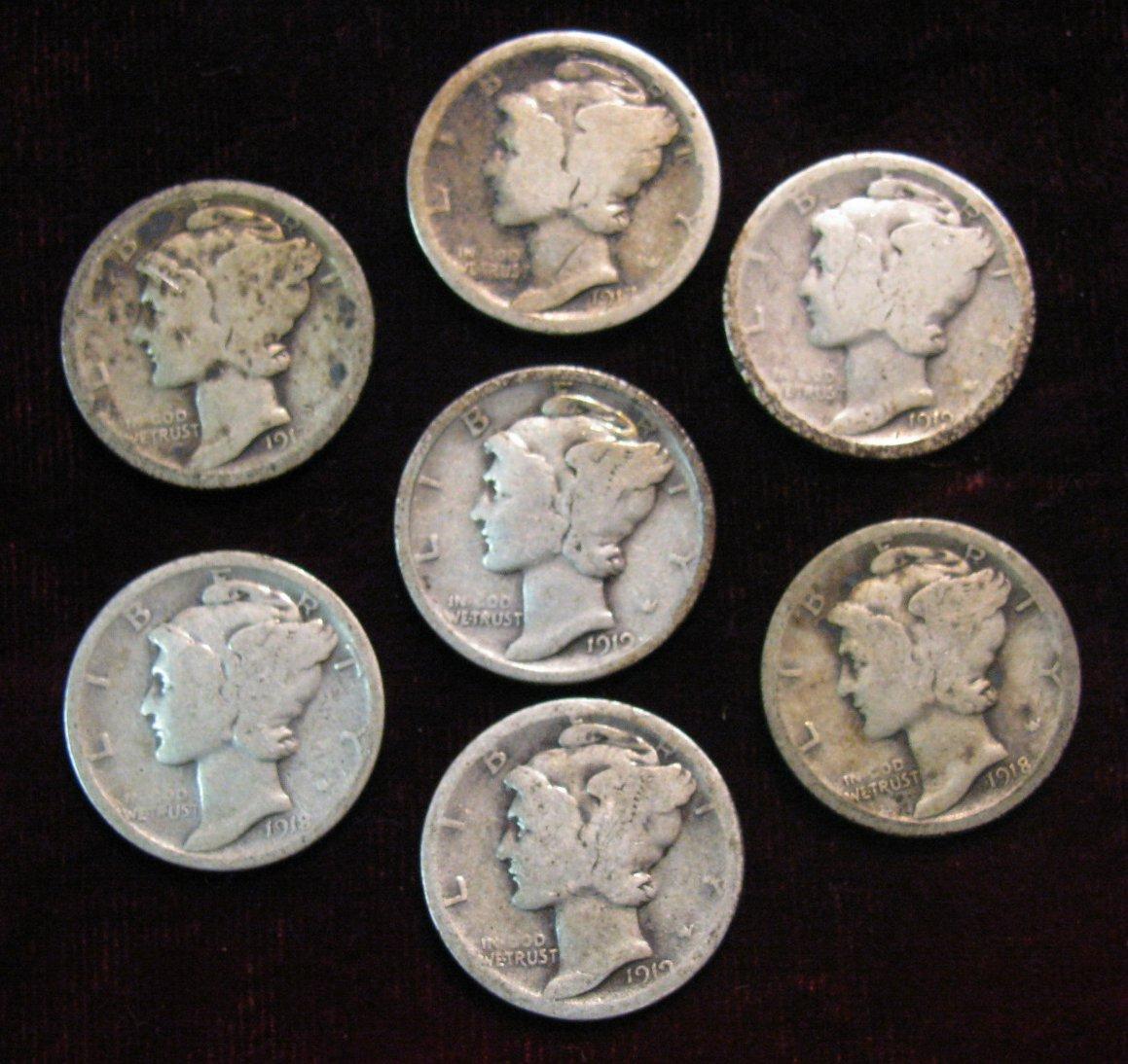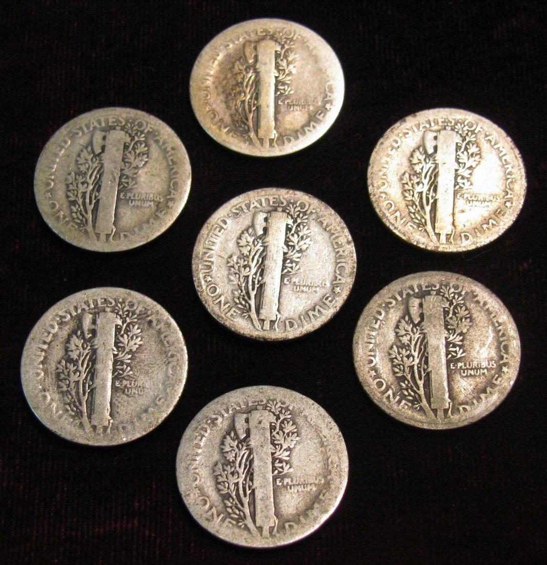 1122. (7) Mercury Dimes dating in the teens. Circulated.
