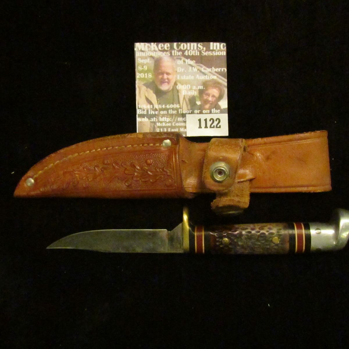 1122 _ Western Sheath Knife with sheath & 3" blade, banded black and red bands with Stag horn and al