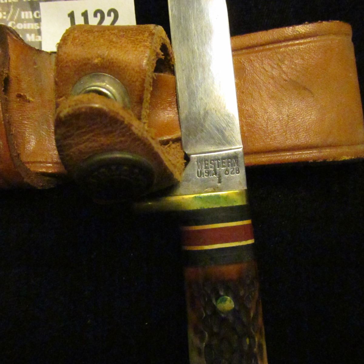 Western Sheath Knife with sheath & 3" blade, banded black and red bands with Stag horn and aluminum pommel, Model 628,, used condition.