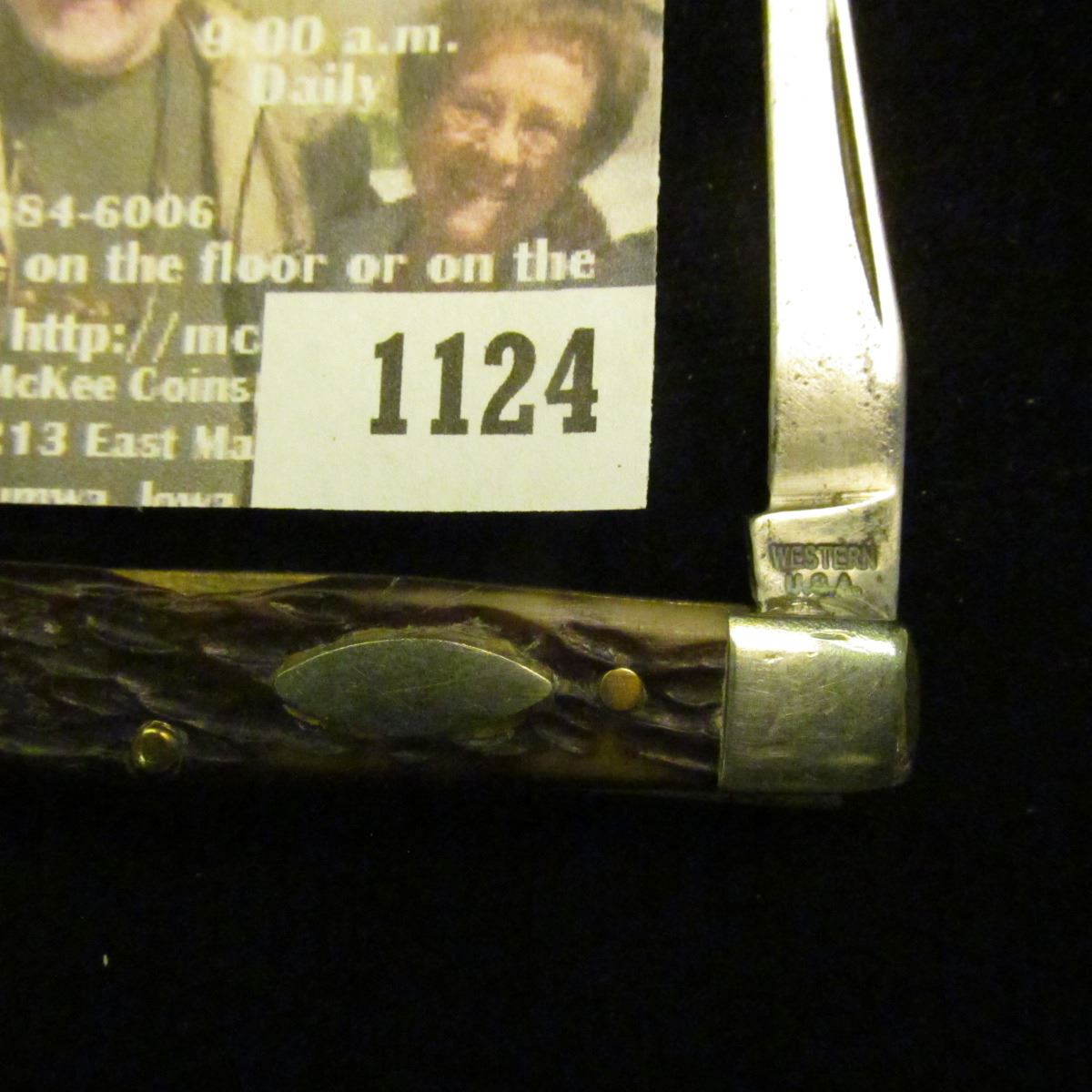 1124 _ Western Two-blade Folder Knife with 2 1/4" blades, Stag horn handle, silver-colored inlay. "W