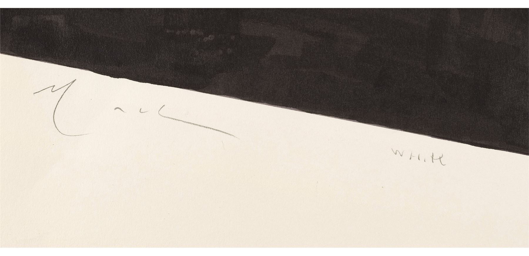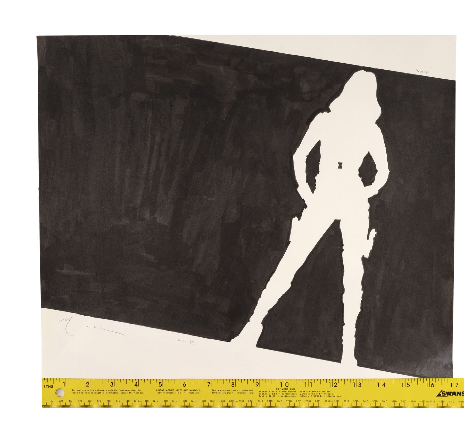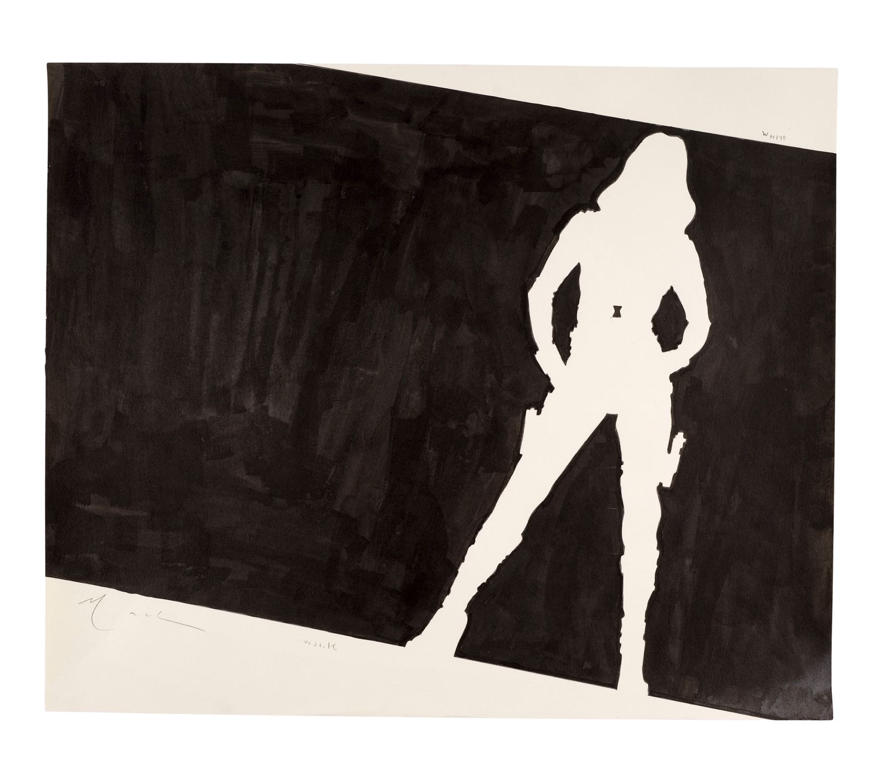 This artwork, the "Near-Final" version featuring Black Widow's silhouette in white with her signature emblem in black at center, is rendered in mixed media on paper, signed by Mack along the left edge, and annotated "white" in the top and bottom margins. The paper exhibits bent corners and edge wear with visible bending at the bottom right edge. Dimensions: 17" x 14" (43.25 cm x 35.75 cm)