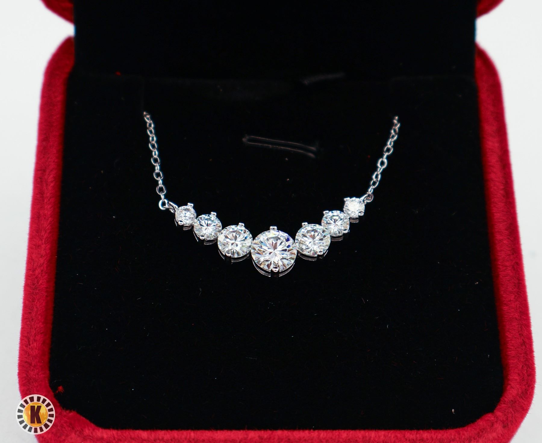 CUT MOISSANITE STONES VVS D COLOR WITH THE 7 MOISSANITE STONES SET IN A V GRADUATING IN SIZE DOWN FROM THE CENTER SET IN 925 SILVER PENDANT RETAIL VALUE $975.00