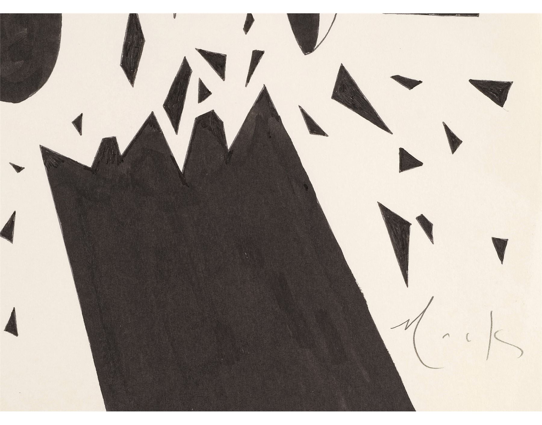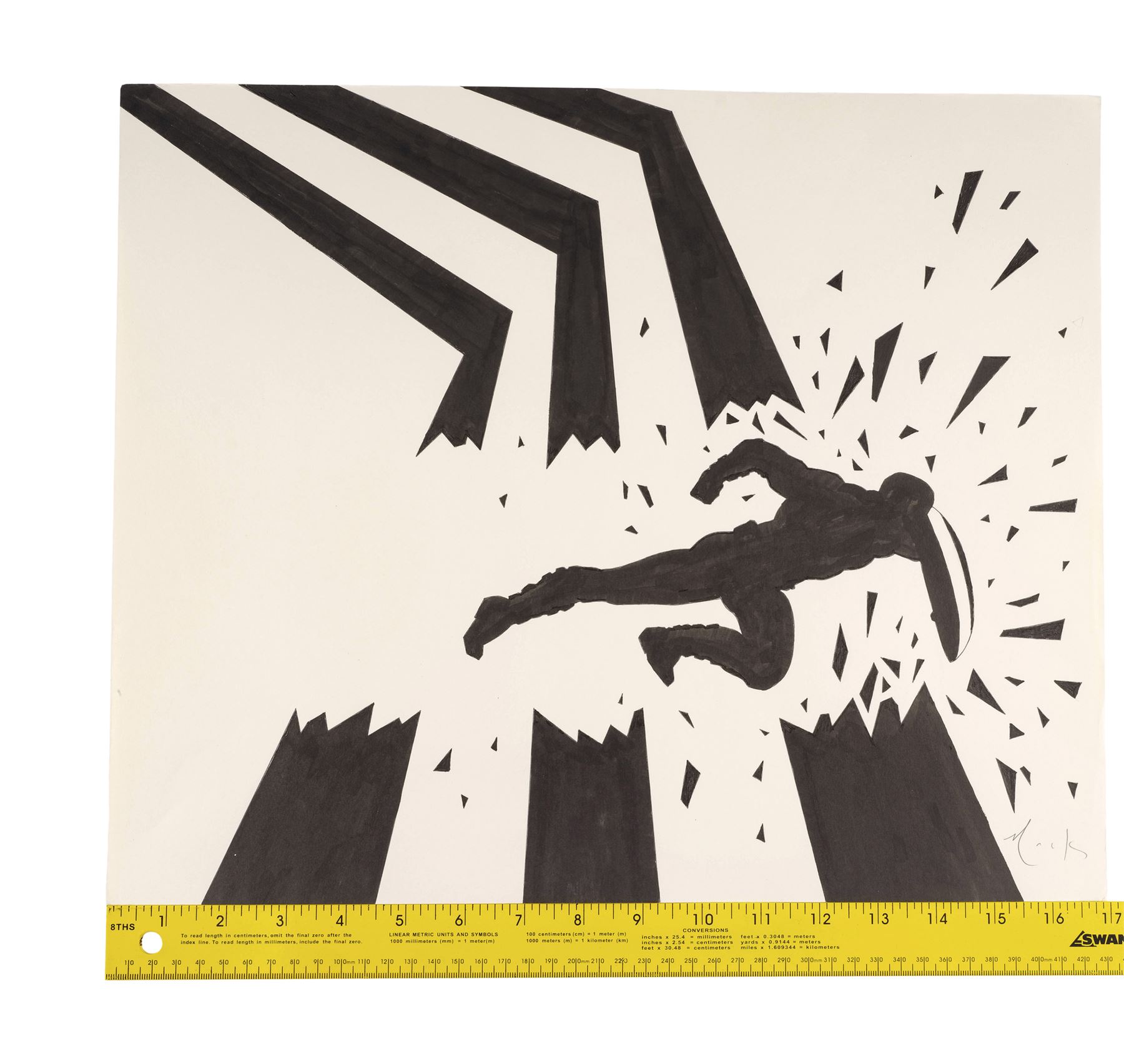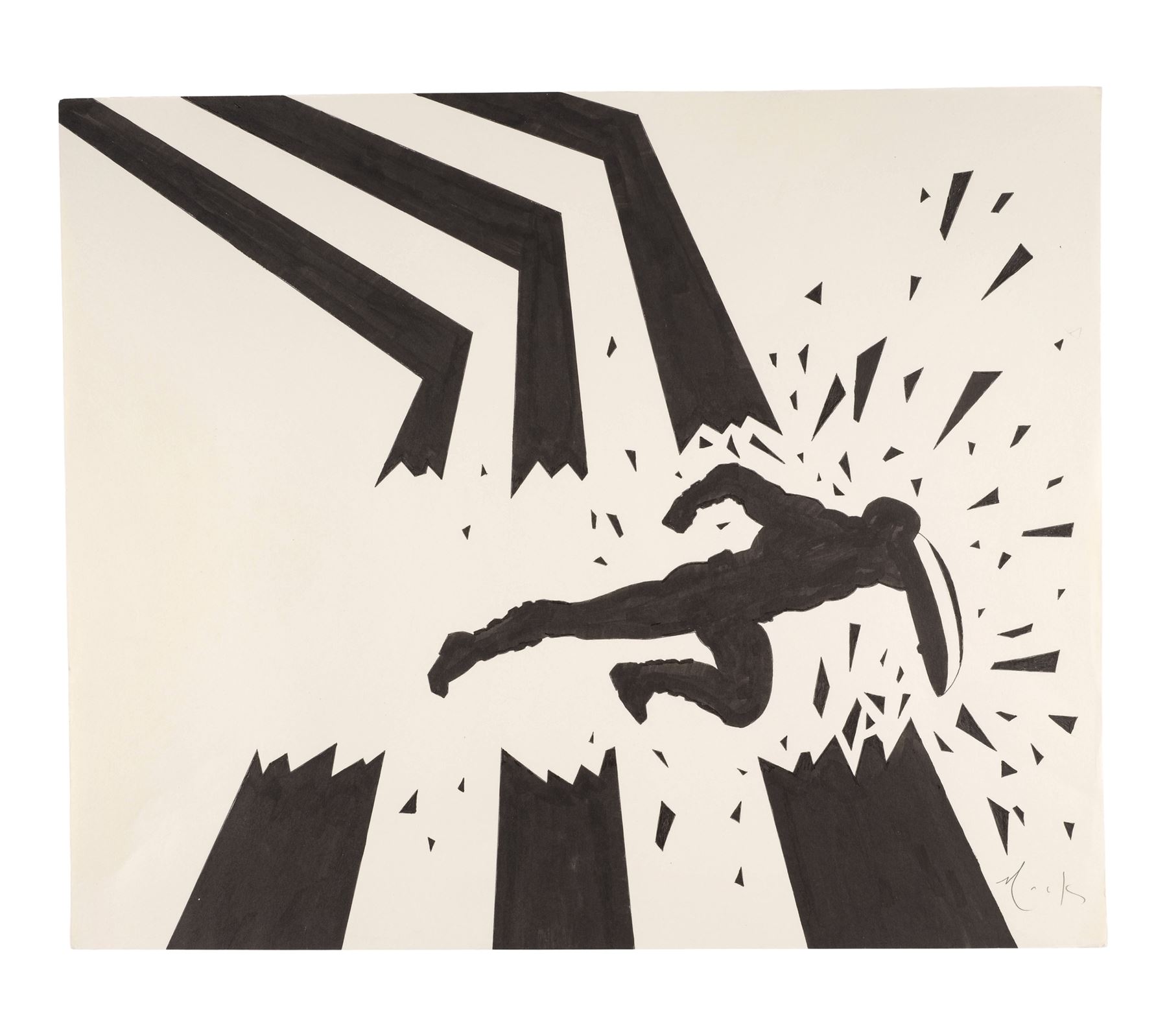 This artwork, the "Near-Final" version featuring Captain America's silhouette smashing through black stripes with his signature shield, is rendered in mixed media on paper and signed by Mack along the bottom edge. The paper exhibits lightly folded corners. Dimensions: 17" x 14" (43.25 cm x 35.75 cm)