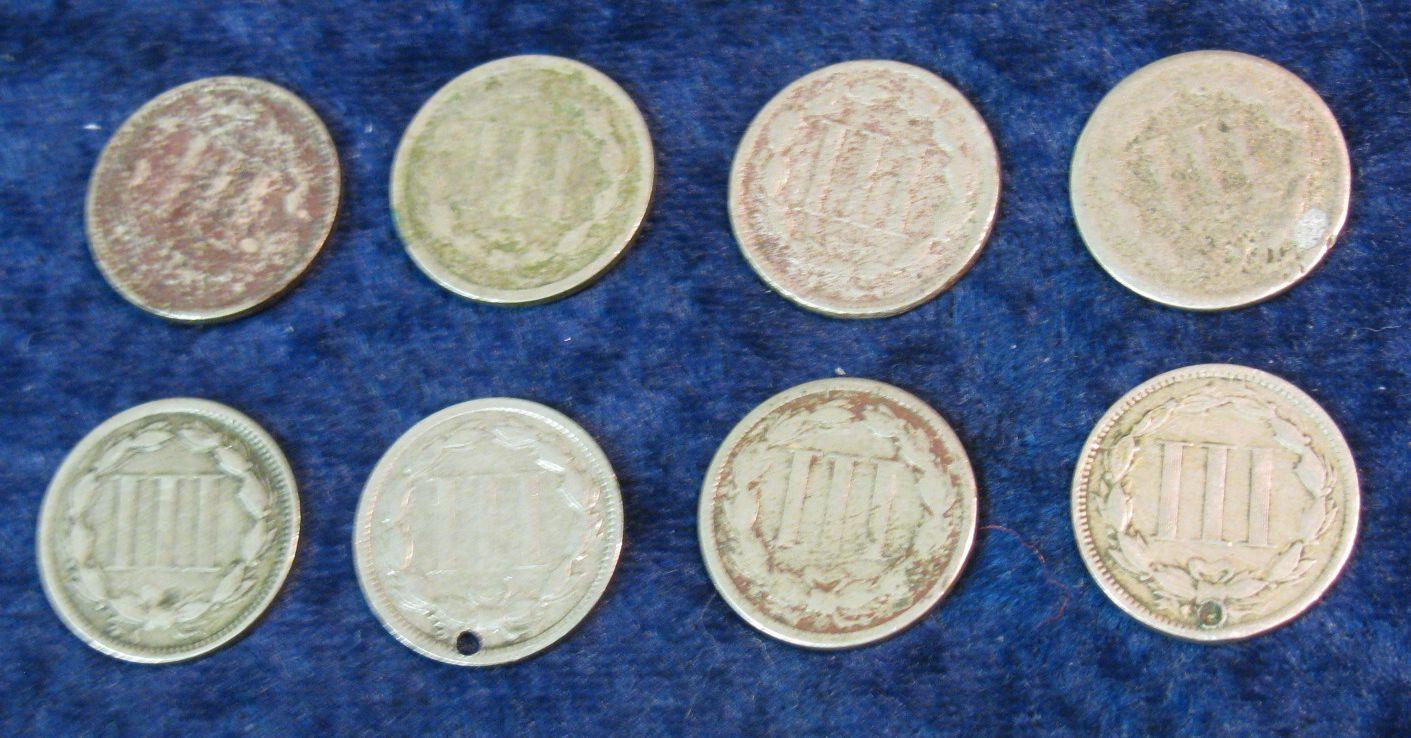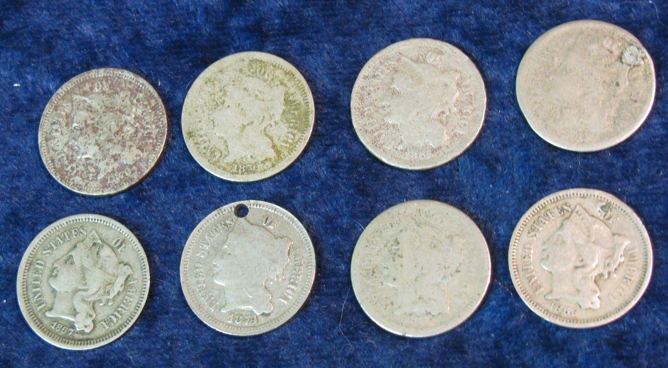 1128. (8) US 3-Cent Nickel Pieces. With Problems Bent and Holed.