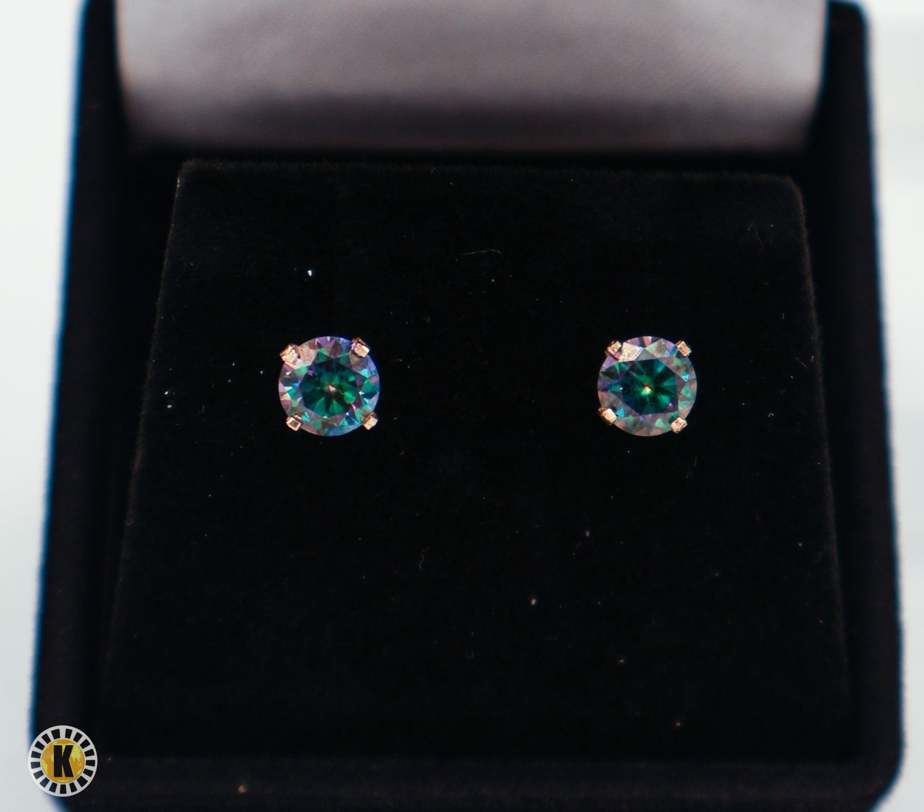 THE 2 ROUND BRILLIANT CUT MOISSANITE STONES VVS INTENSE DARK GREEN COLOR WEIGHING A TOTAL 1.00 CT SET IN THE EARRINGS