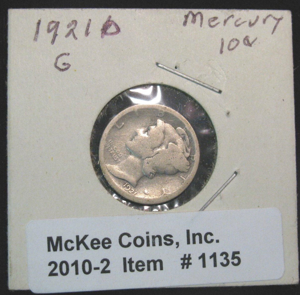1135. 1921 D Mercury Dime. G-4. Reverse rim worn, but a very Rare date.