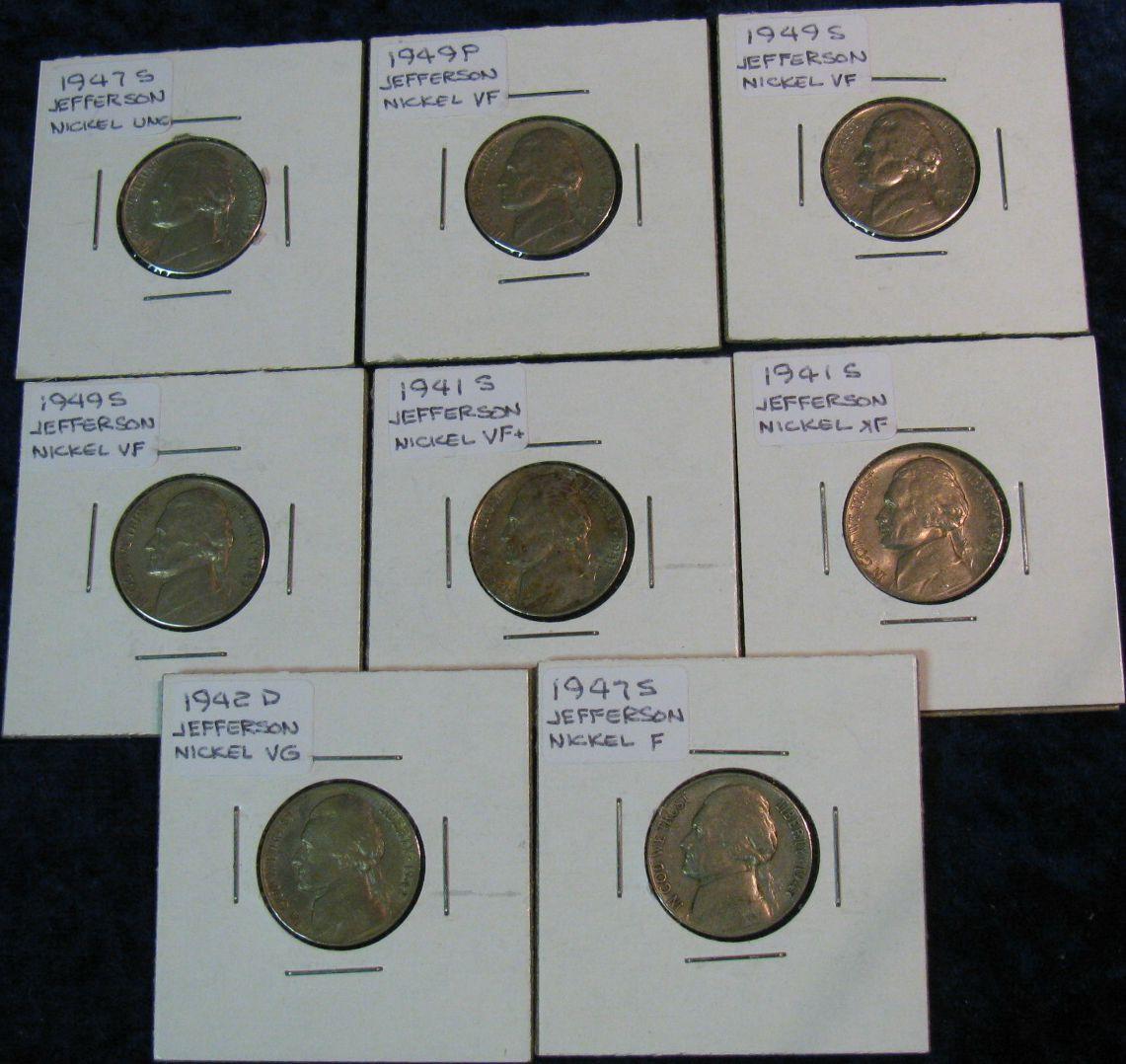 1137. (2) 41S, 42D, (2) 47S, 49P & (2) 49S Jefferson Nickels. VG-Unc.