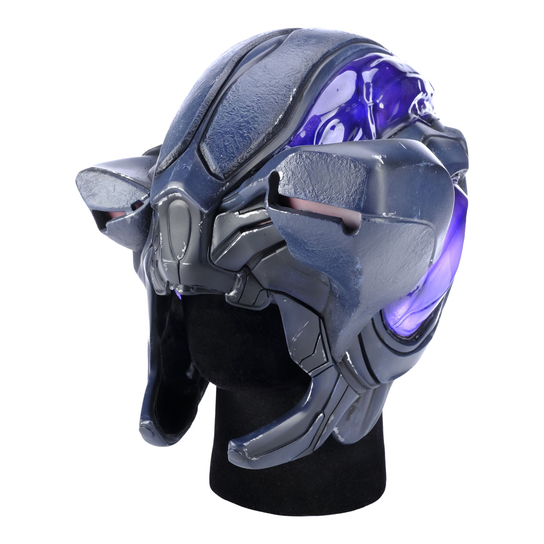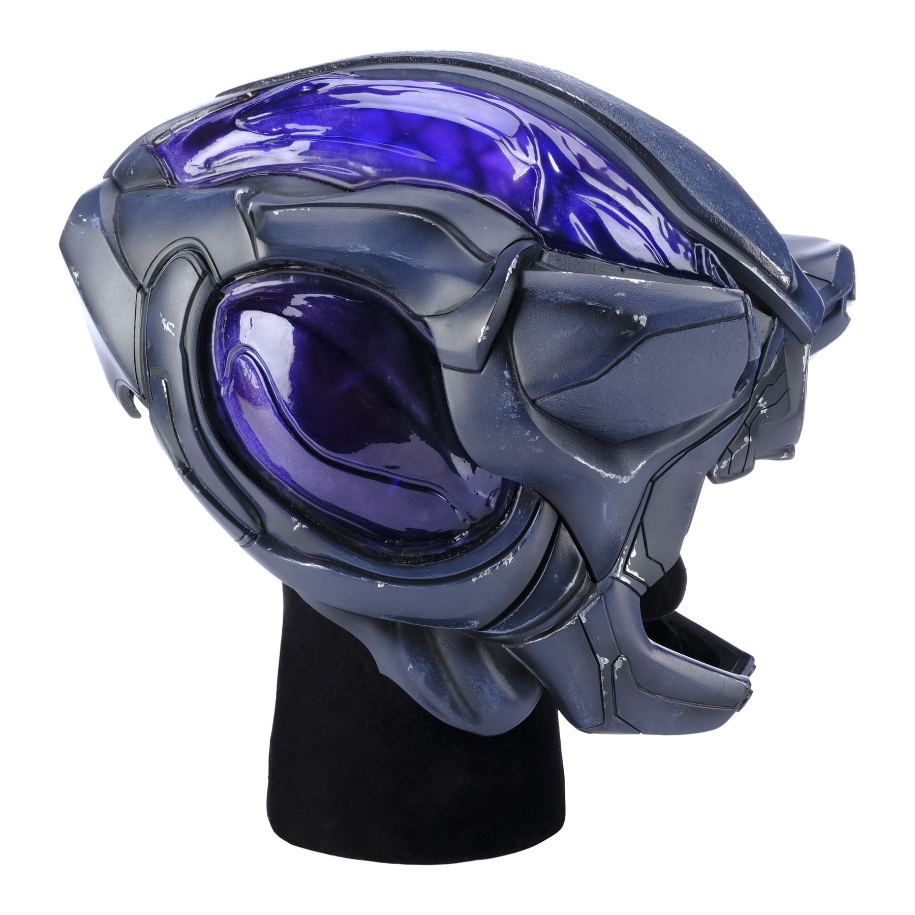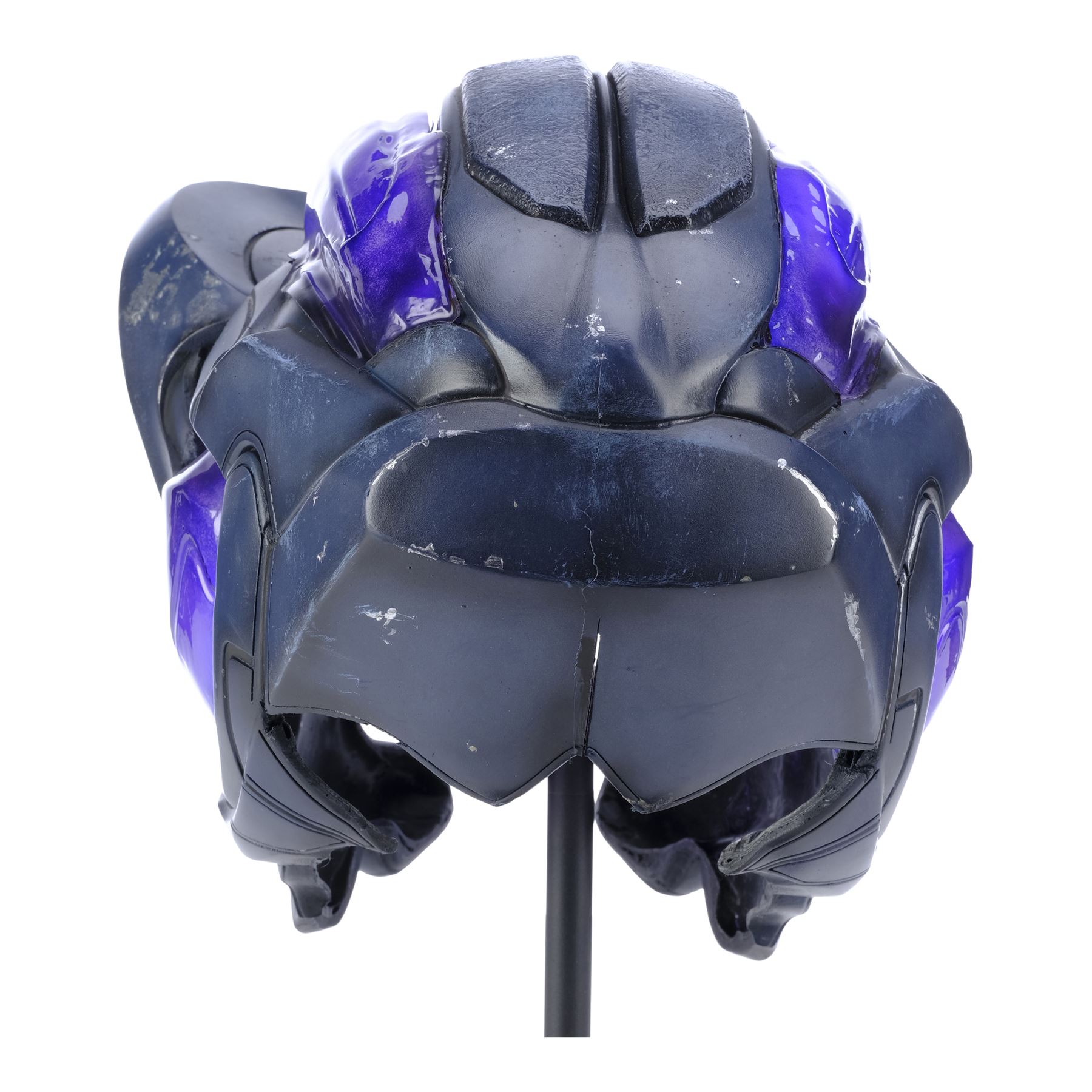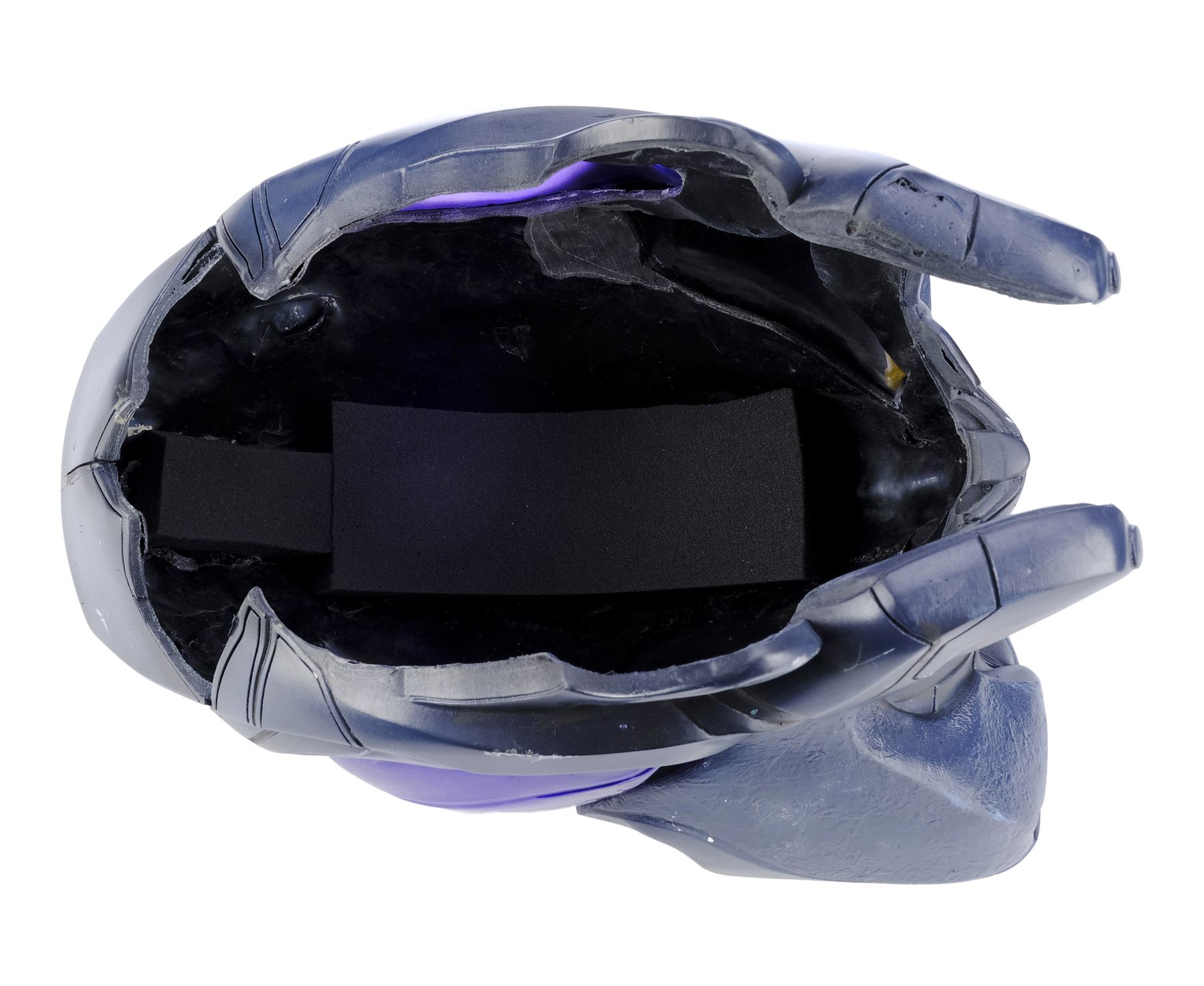 This foam helmet with a futuristic extraterrestrial design is painted a metallic navy blue with iridescent bluish-purple vacuum-formed plastic panels and soft padded foam on the inside. It exhibits discoloration, notable adhesive residue on the interior, fragile adhesive around the panels, and a cut on the back of the helmet.