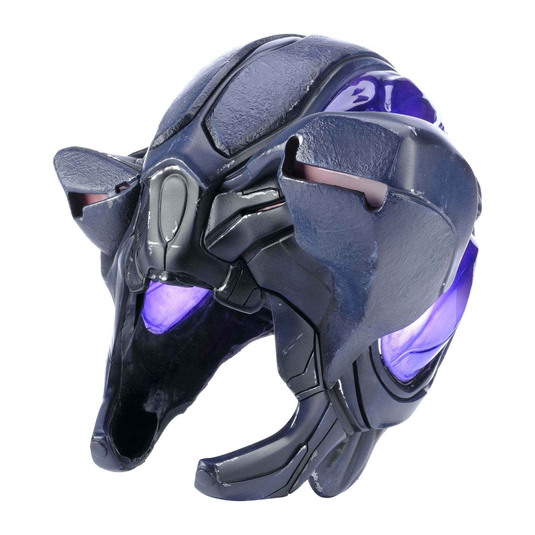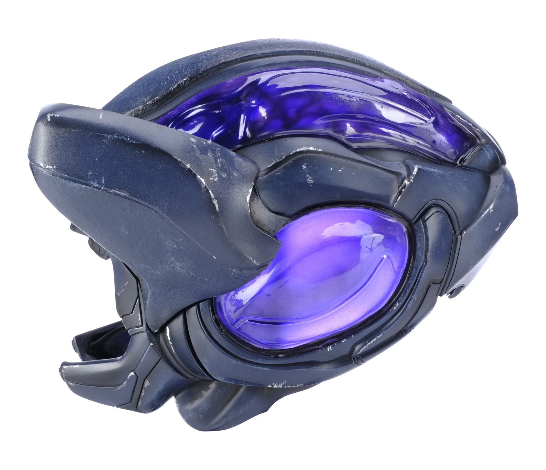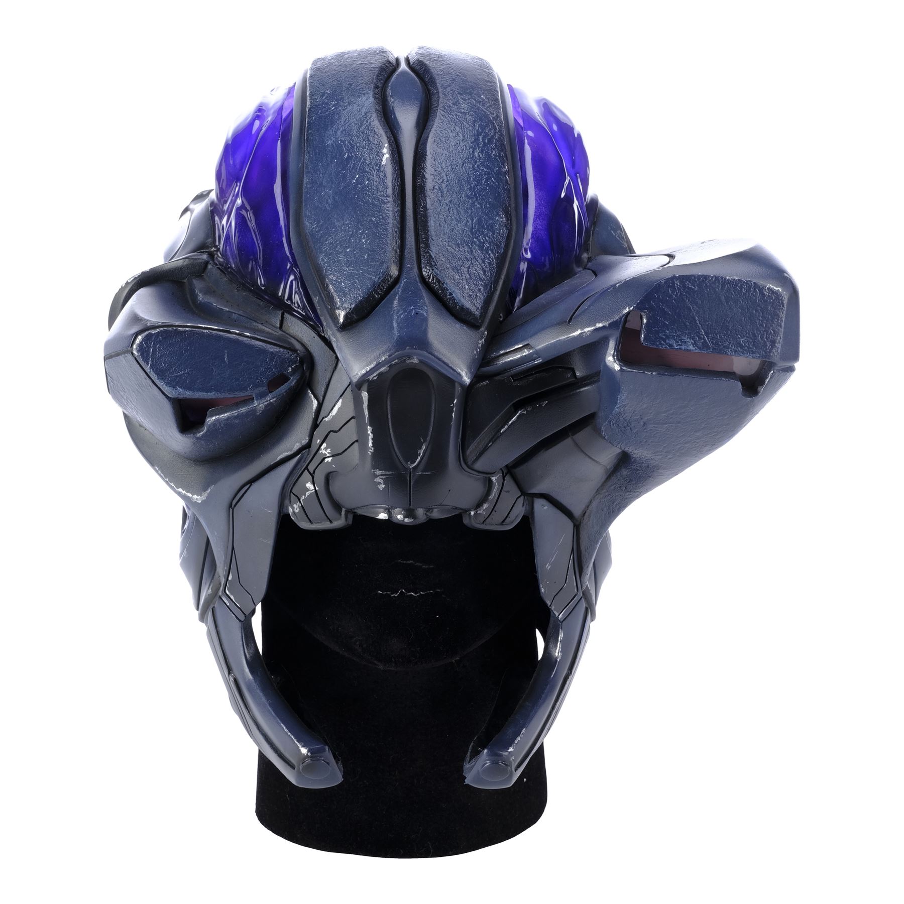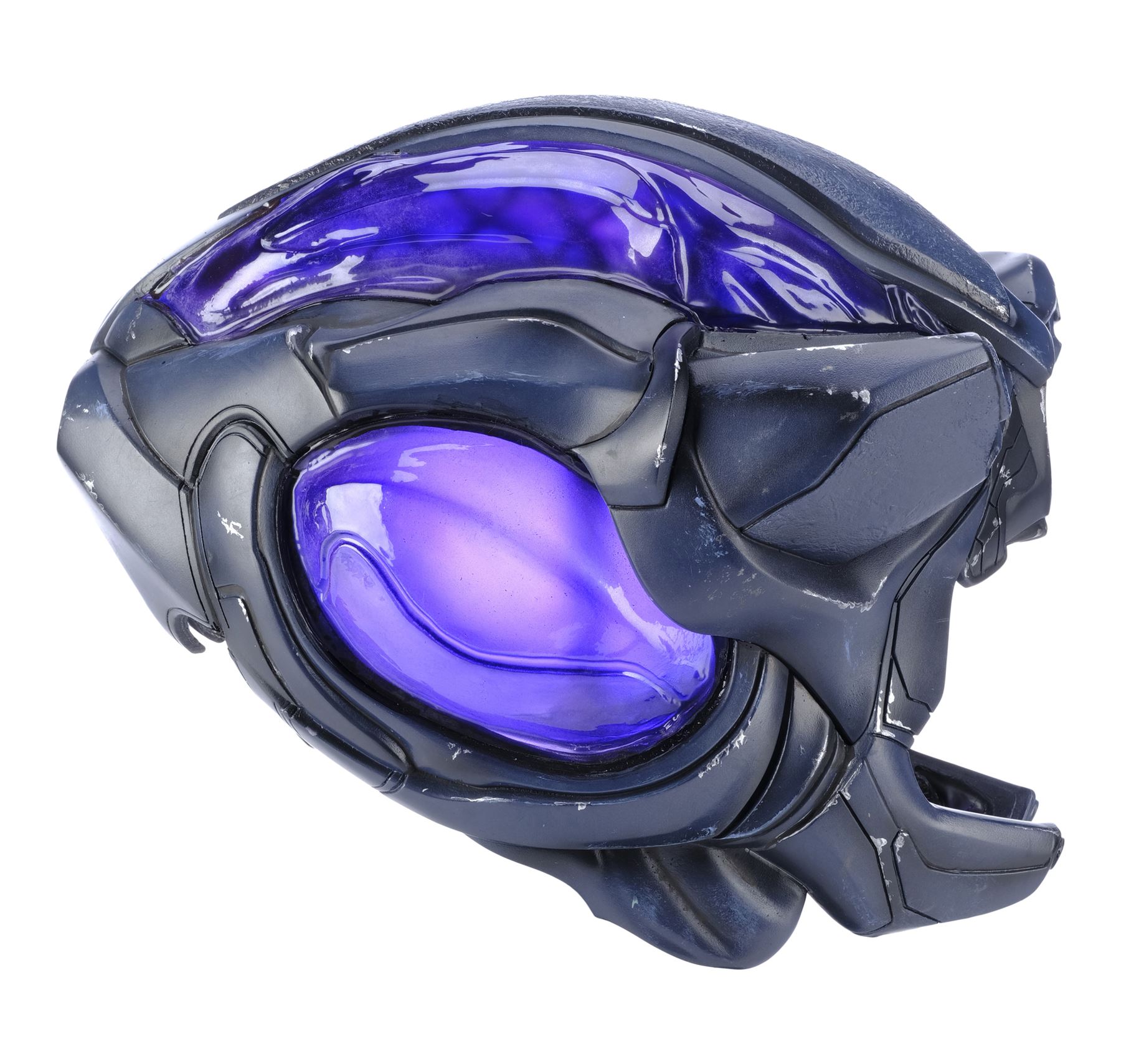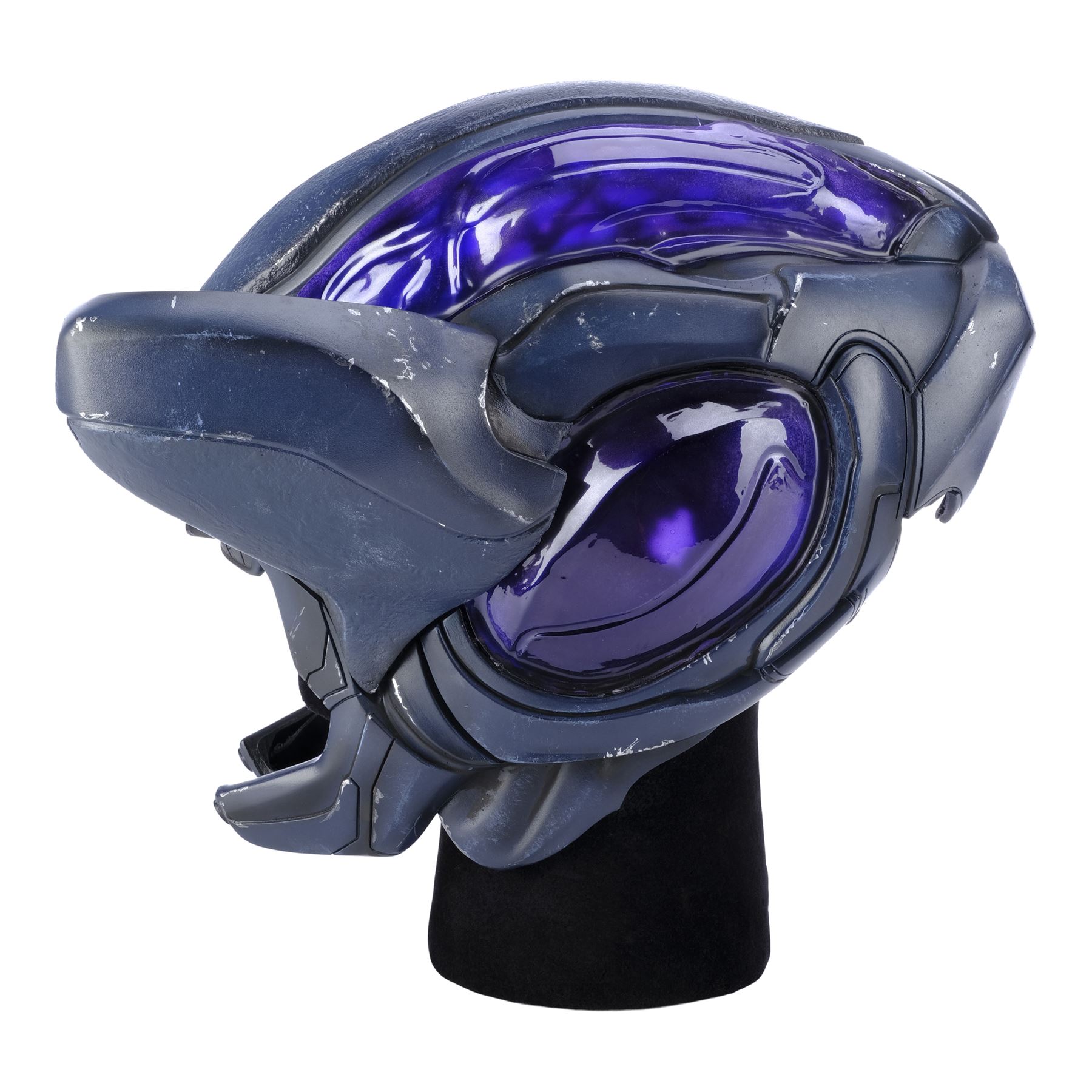 This foam helmet with a futuristic extraterrestrial design is painted a metallic navy blue with iridescent bluish-purple vacuum-formed plastic panels and soft padded foam on the inside. It exhibits discoloration, notable adhesive residue on the interior, fragile adhesive around the panels, and a cut on the back of the helmet.