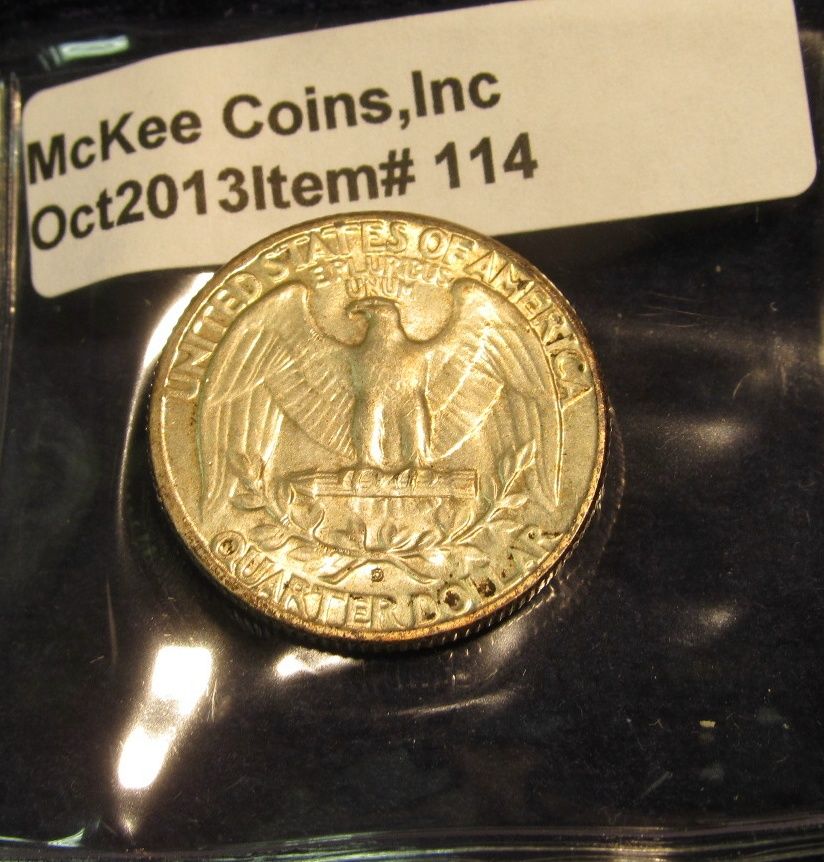 114. 1950 D Washington Quarter. Toned Unc. Redbook value $35.00.
