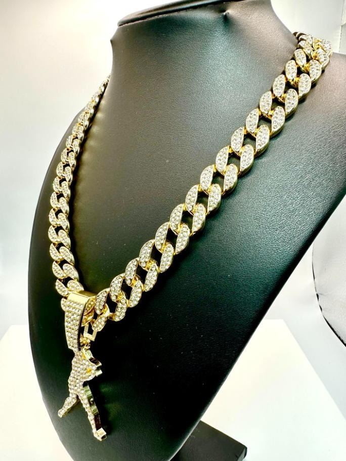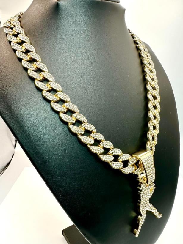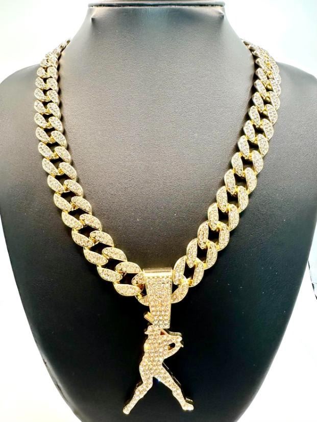 Huge 114.5 Gram MLB Sparkling Miami Ice Link Chain Necklace. It is 15 mm wide and 20" long. It weighs a stealth 114.5 Grams; it looks like Solid Gold without the Solid Gold Price. This Baseball Chain and Pendant Wins the Pennant Every time.