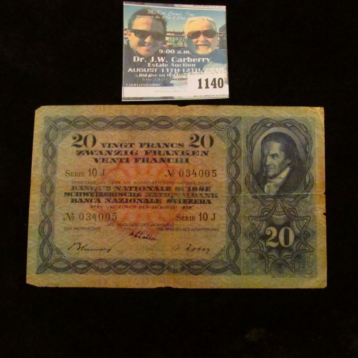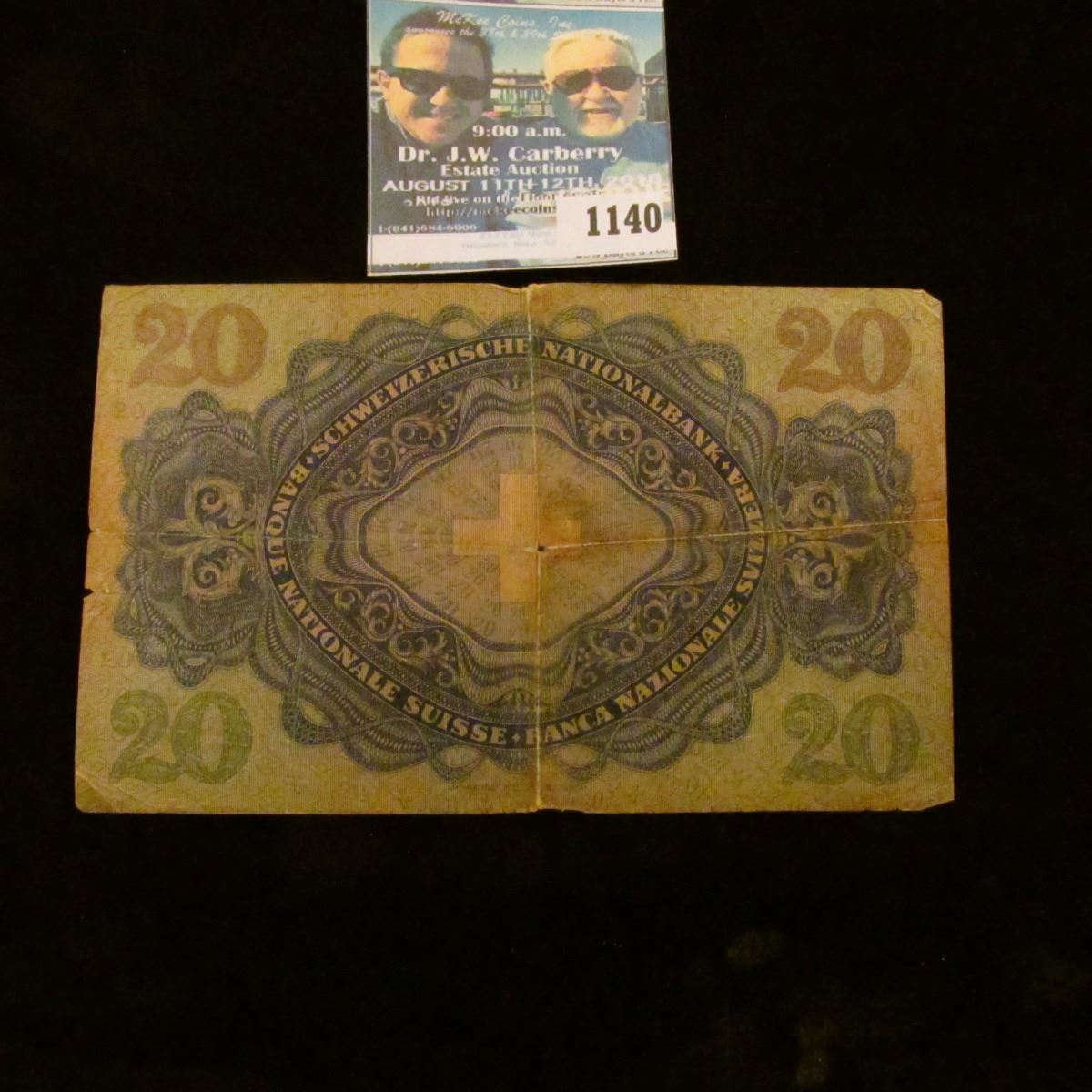 1140 _ 1936 National Swiss Bank in Zurich, VG. 'Doc' valued this note at $20
