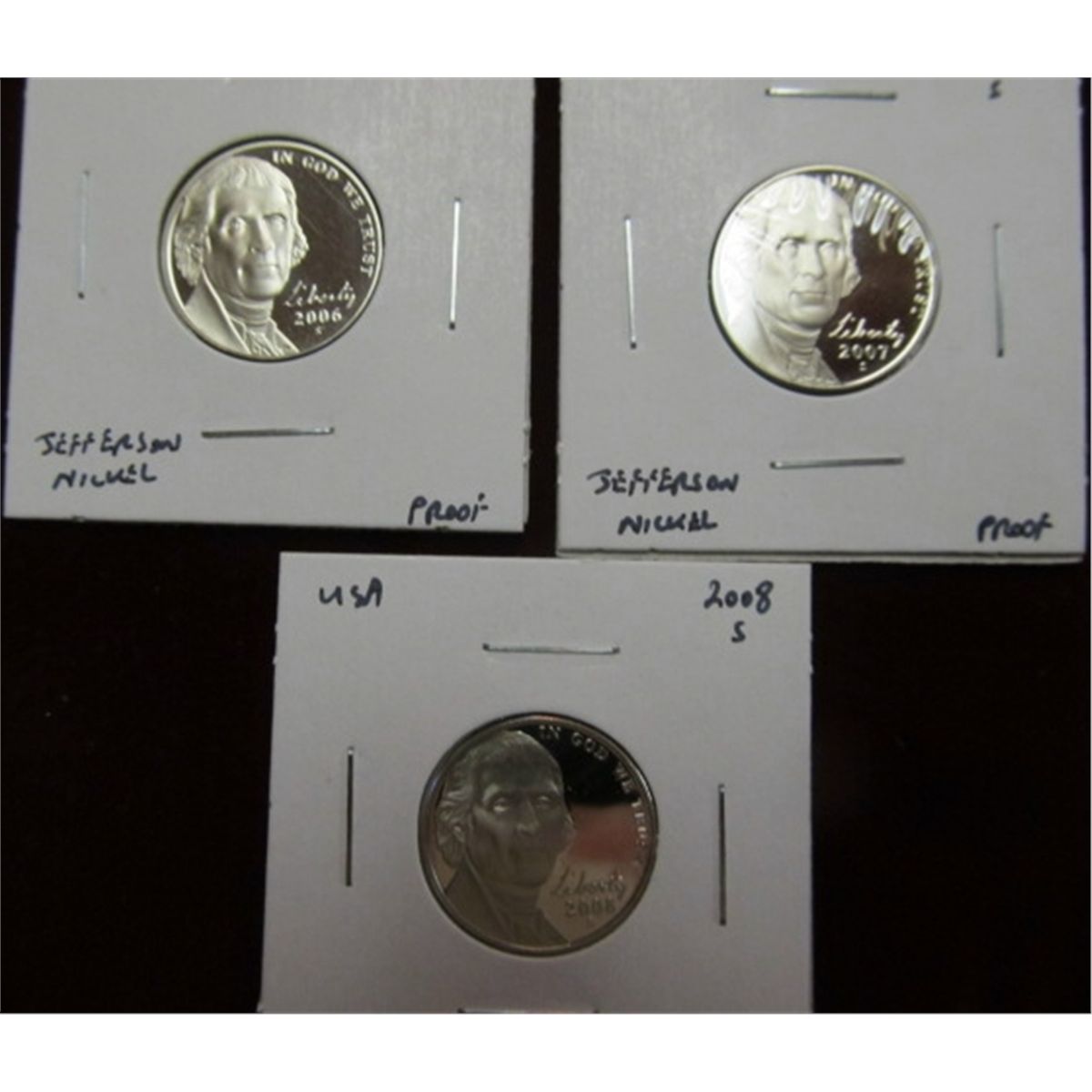 1143. 2006S, 07S, & 08S Proof 65 Jefferson Nickels.