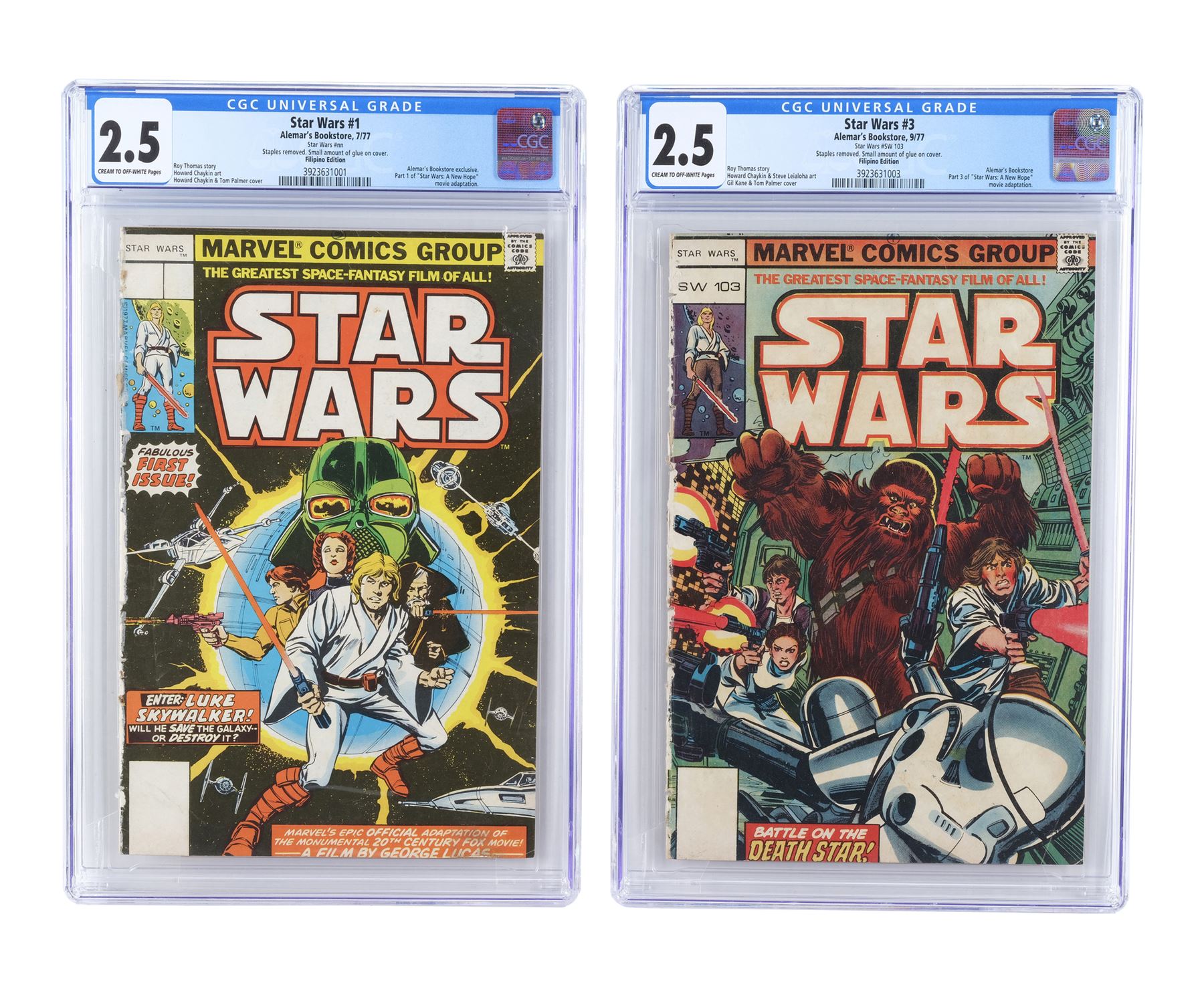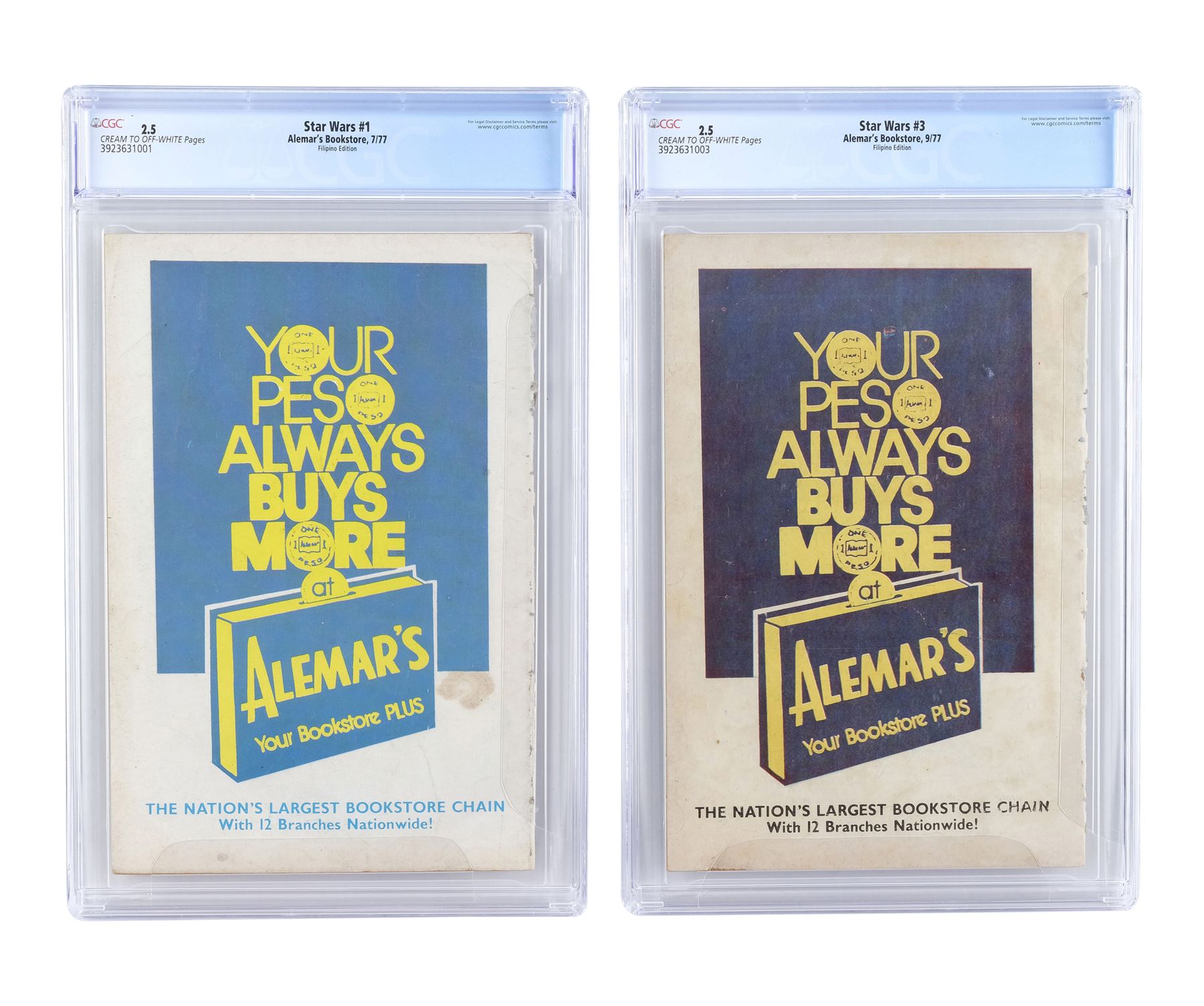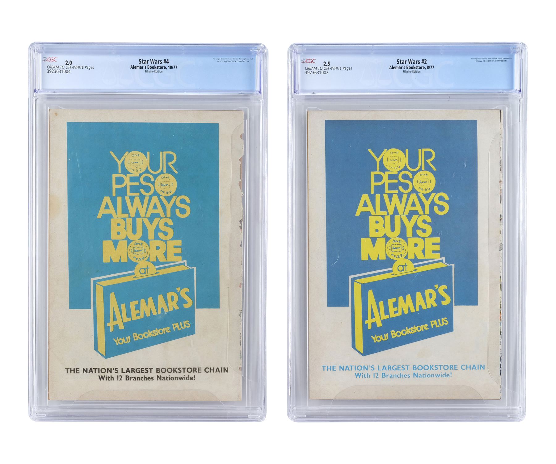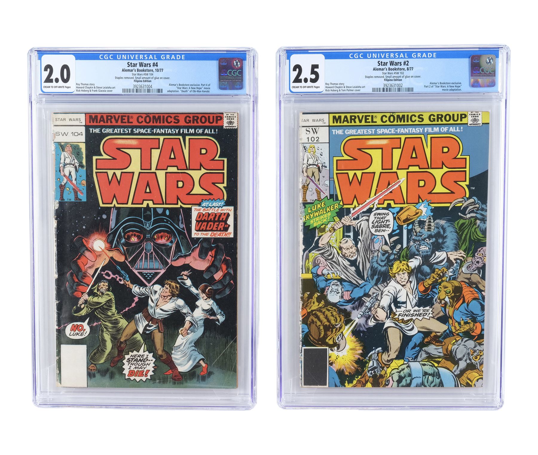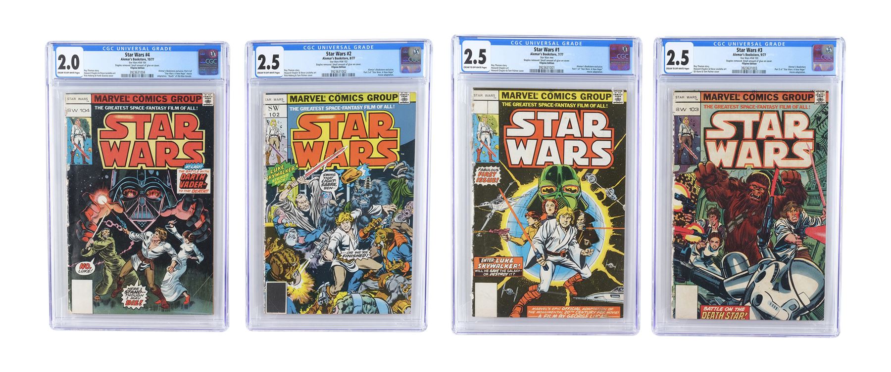 MARVEL COMICS - CGC-Graded Star Wars No. 1-4 Alemar's Bookstore Variant Comics - Star Wars issues 1 through 4 published between April and July 1977 by Marvel Comics. These rare Filipino edition variants were printed exclusively to be sold through Alemar's Bookstore in the Philippines. All four issues were written by Roy Thomas with pencils by Howard Chaykin, who also inked issue 1. Steve Leialoha inked issues 2 through 4.