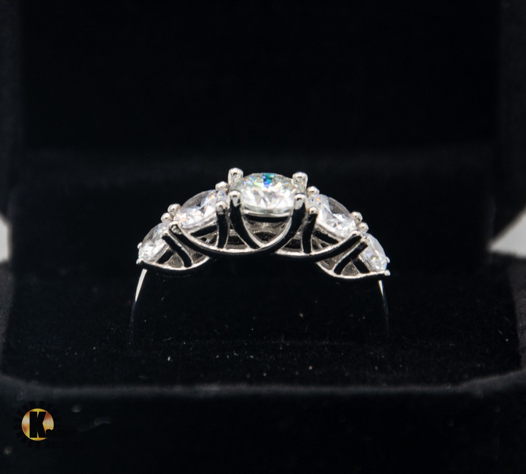 MOISSANITE STONE VVS D COLOR SET IN CENTER WITH 2 GRADUATING CUBIC ZIRCONIA SET ON EITHER SIDE SET IN 925 SILVER RING SIZE 7.75 **ALL ITEMS MUST BE REMOVED BY 5PM SATURDAY, DECEMBER 14th 2024. ALL REMAINING ITEMS WILL BE SUBJECT TO A $6.00 PER DAY STORAGE CHARGE. ANY ITEMS REMAINING AFTER MONDAY, DECEMBER 30TH 2024 WILL BE CONSIDERED FORFEITED. NO REFUNDS WILL BE ISSUED FOR FORFEITED ITEMS. TO SCHEDULE A PICK UP APPOINTMENT CLICK HERE