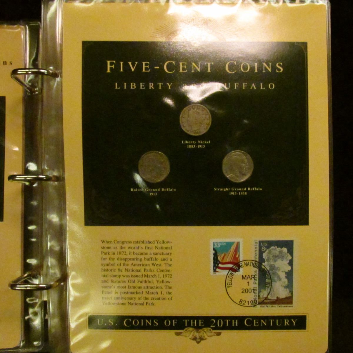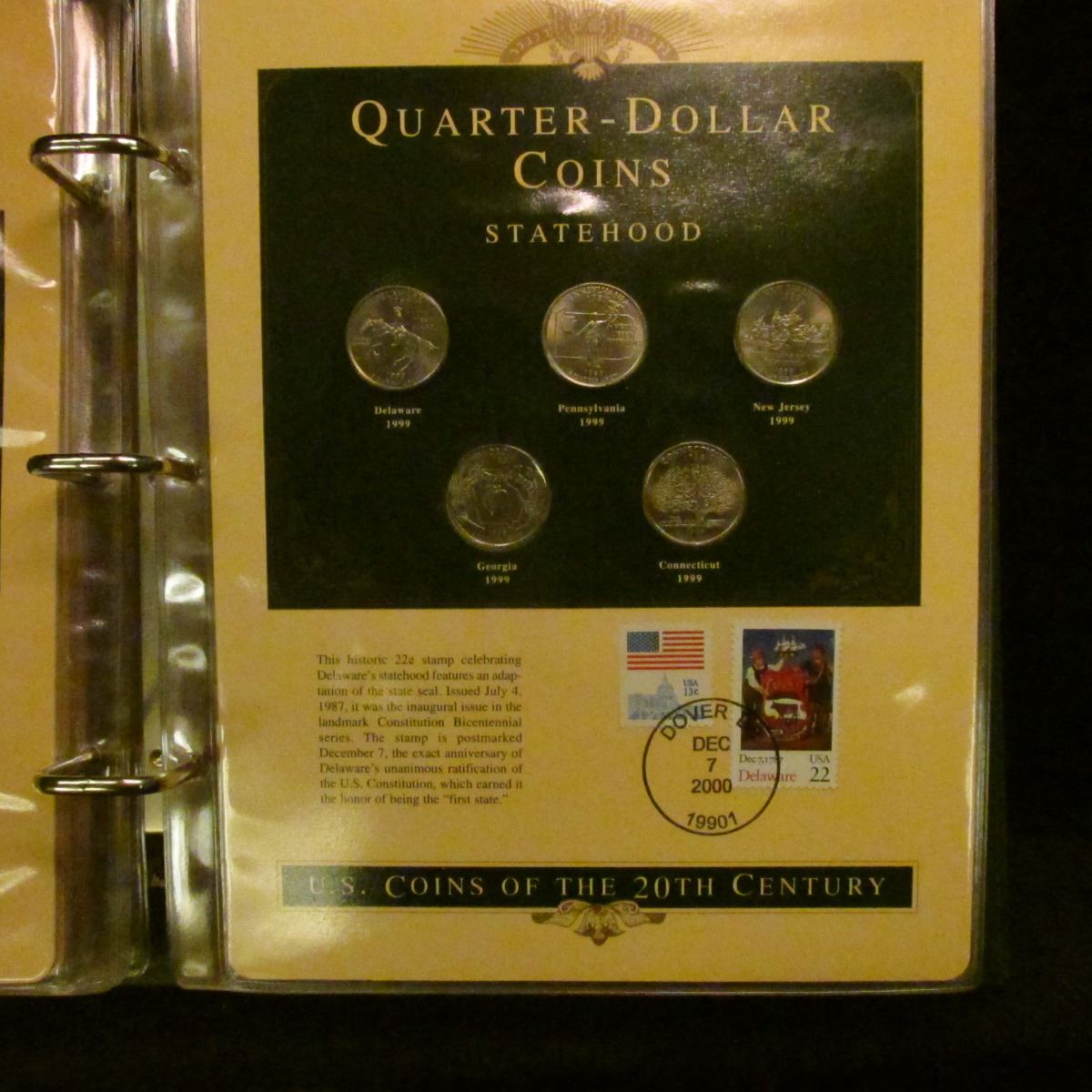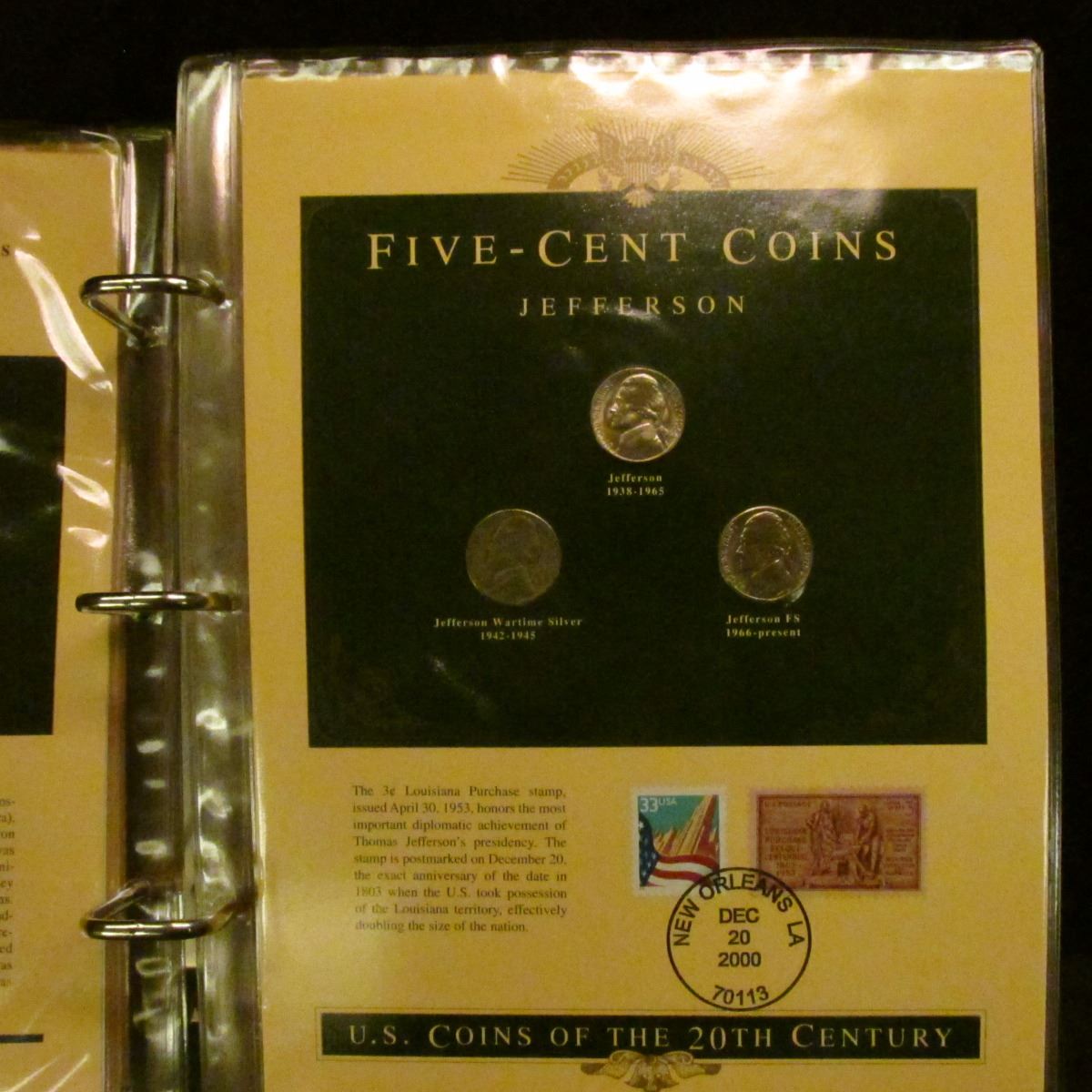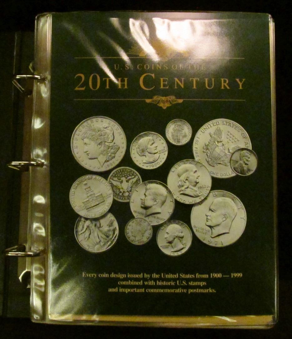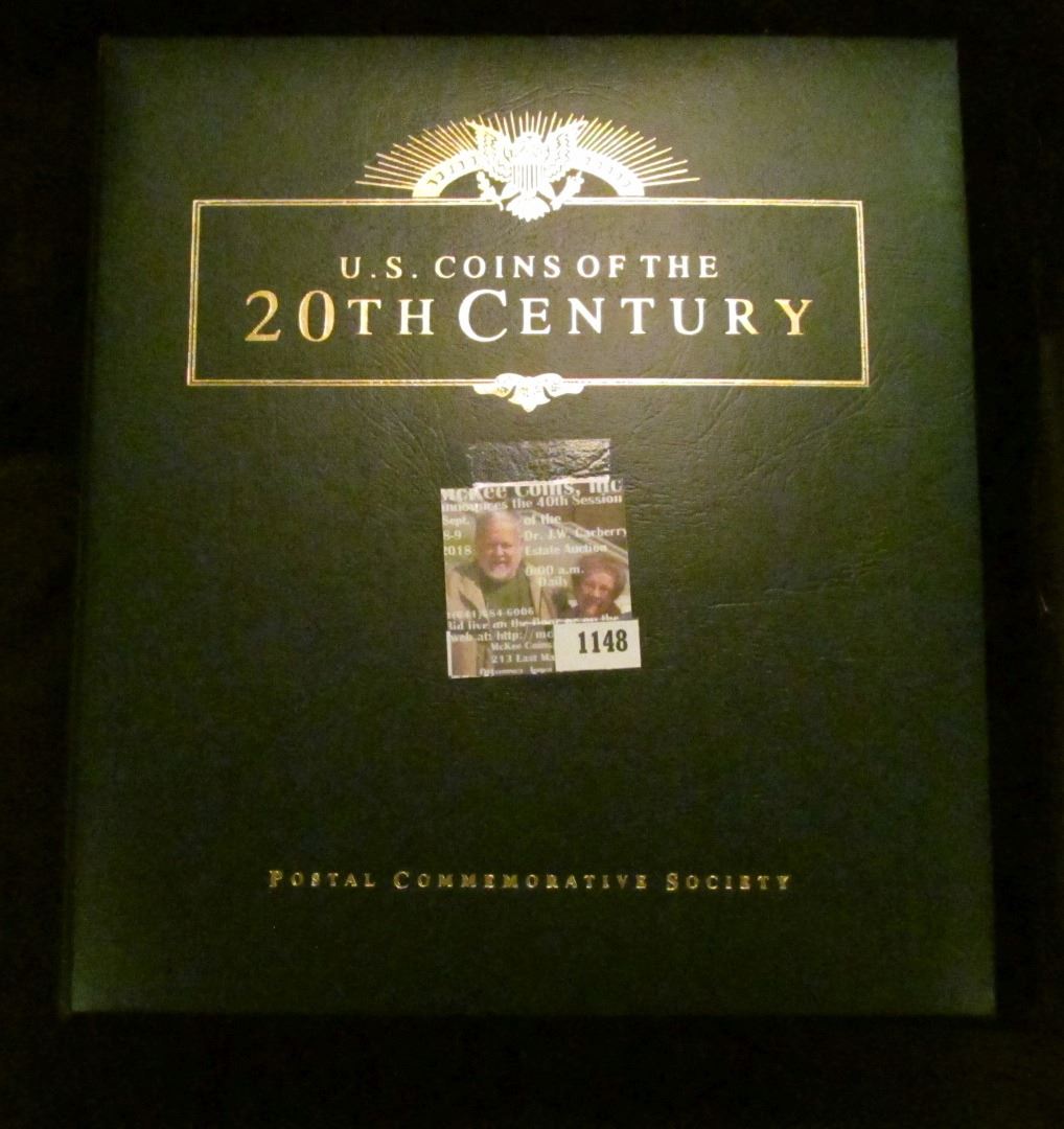 Postal Commemorative Society "U.S. Coins of the 20th Century" Album with Coins including: (7) different Indian and Lincoln Cents with stamps; (3) Liberty and Buffalo Nickels with stamps; (3) Jefferson Nickels including a silver War Nickel with stamps; (4) Barber, Mercury and Roosevelt Dimes with stamps; (4) Silver & Clad Washington Quarters with stamps; (5) 1999 Statehood Quarters with stamps; Liberty Head (Barber) Quarter with stamps; 1917 P T.1 & 1930 S Standing Liberty Quarters with stamps; 1902 P Barber Half Dollar with stamps; Walking Liberty (circ) and BU Franklin Half Dollar with stamps; Silver, Silver-clad, & Copper-nickel Kennedy Half Dollars with stamps; Bicentennial Kennedy Silver & Alloy Half-dollars; 1921 S Morgan Silver Dollar with stamps; 1922 P Silver Peace Dollar with stamps; 1971 S Silver & 71 D BU Clad Eisenhower Dollars with stamps; 1976 S Silver & 76 D BU Eisenhower Dollars with stamps; 1980 S Susan B. Anthony Dollar BU, 2001 BU Silver American Eagle One Ounce Dollar & stamps.