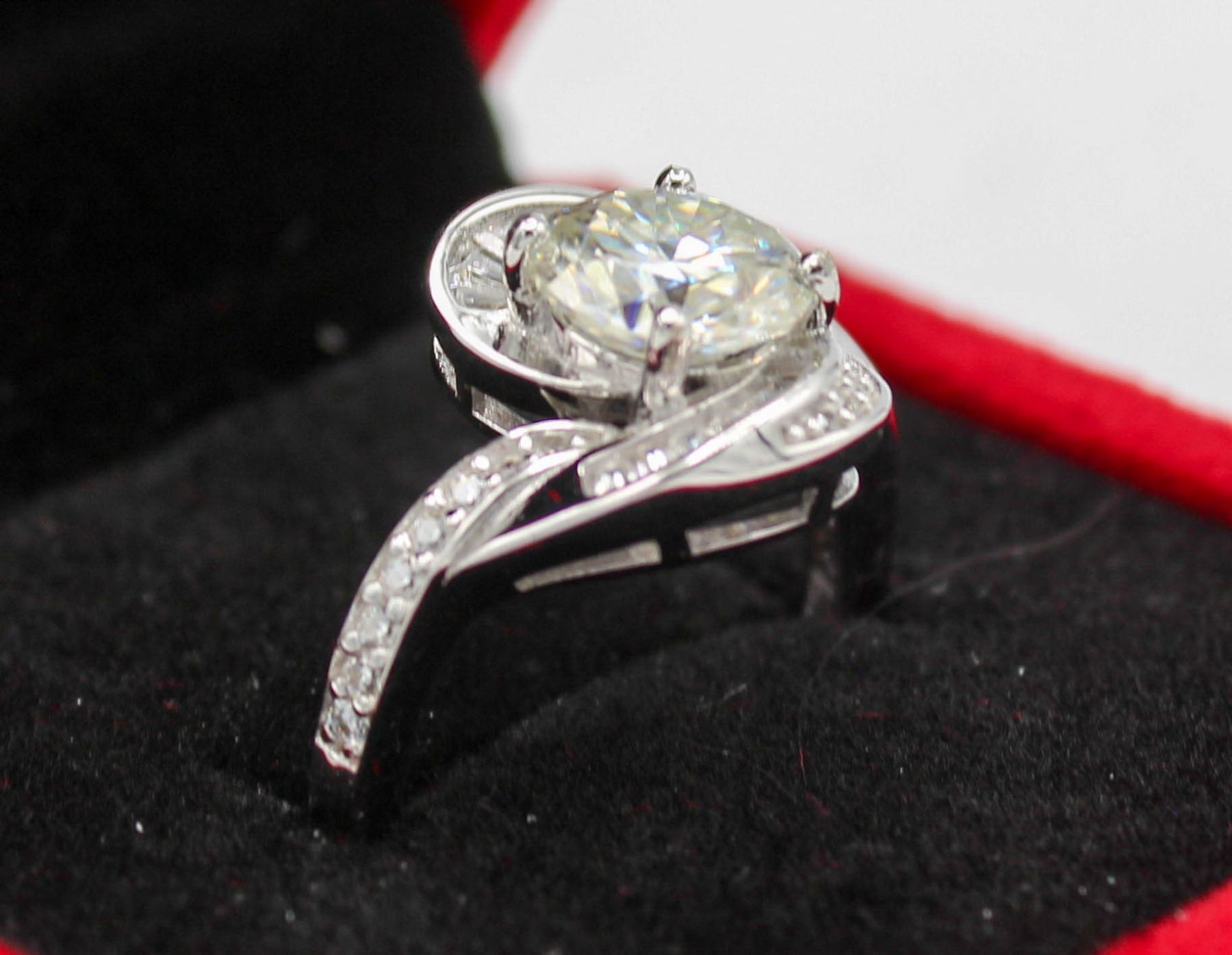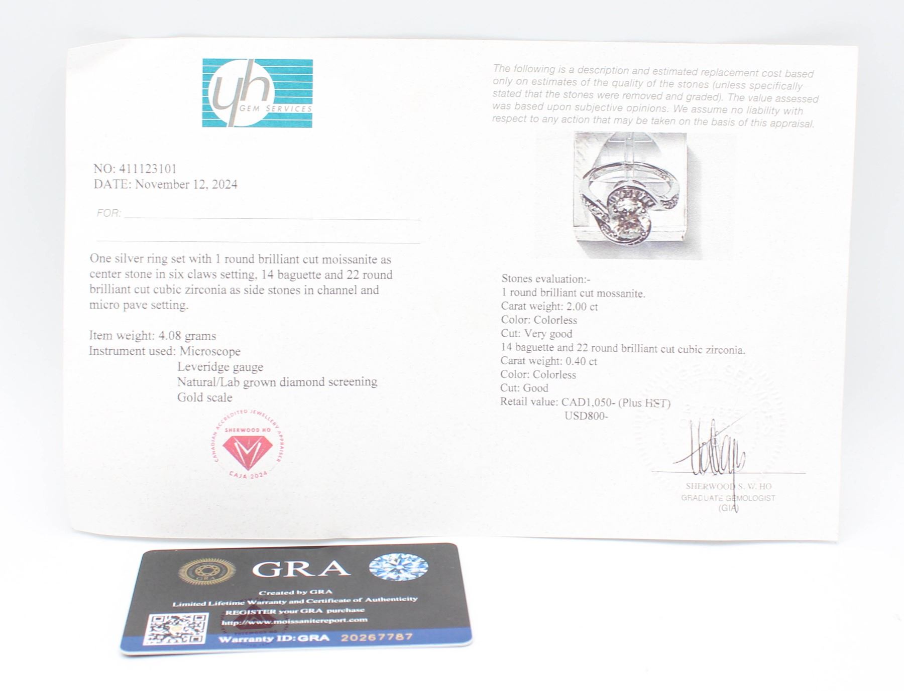 CUT MOISSANITE STONE VVS D COLOR WITH 14 BAGUETTE AND 22 ROUND BRILLIANT CUT CUBIC ZIRCONIA SET AROUND CENTER WITH MORE SET IN THE SHANK SET IN 925 SILVER RING SIZE 7 RETAIL VALUE $1,050.00