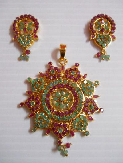 115.35 CTW GOLD PLATED EMERALD AND RUBY PENDANT AND EAR **|**|** 115.35 CTW GOLD PLATED EMERALD AND RUBY PENDANT AND EARRING SET STERLING SILVER ; MSRP: $1175