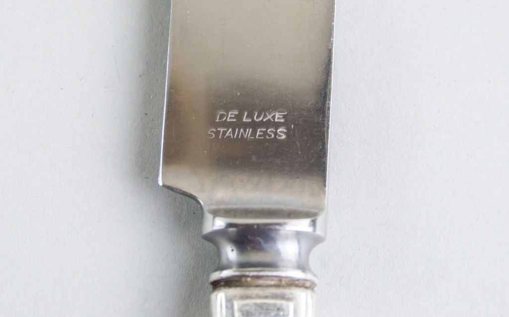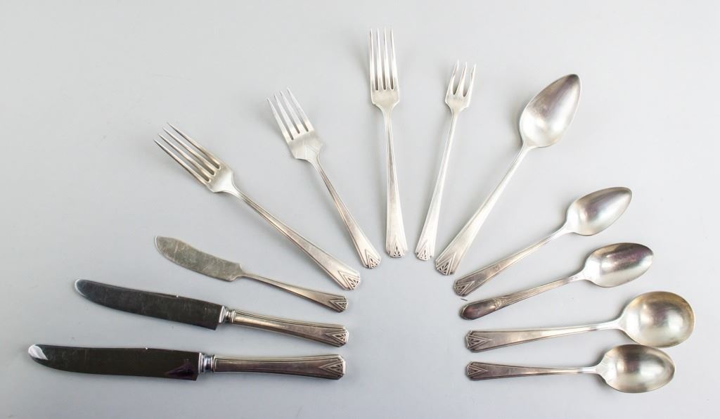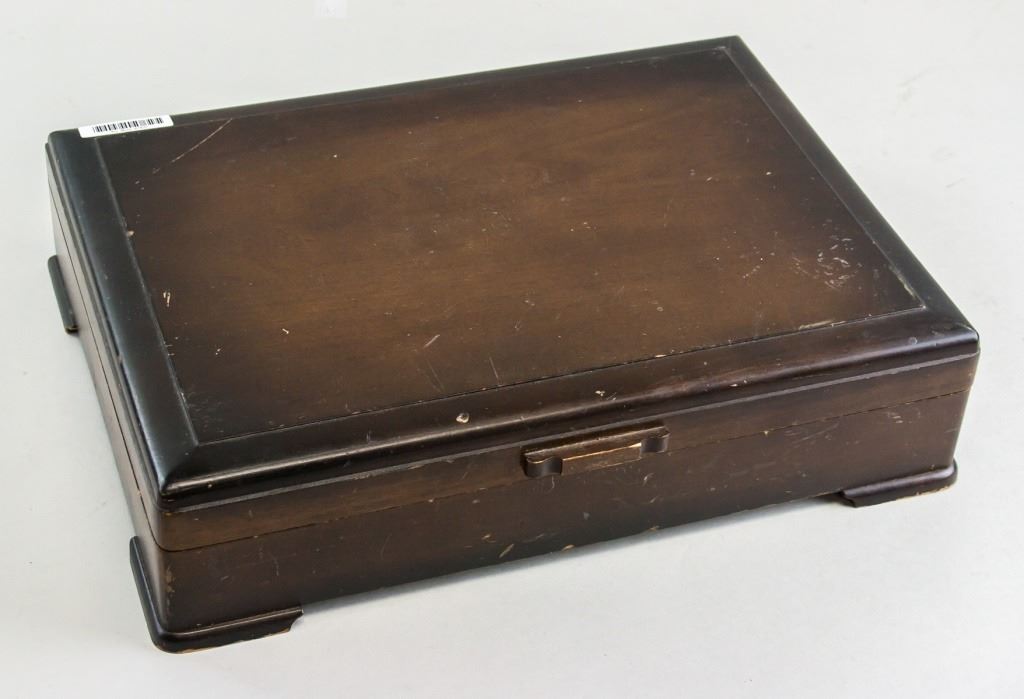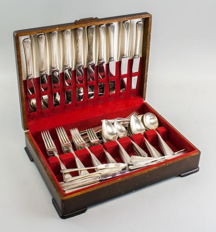 115-piec silverware set, with wooden storage container. "DE LUXE STAINLESS". 8.5 x 37 x 27 cm. 6 kg.