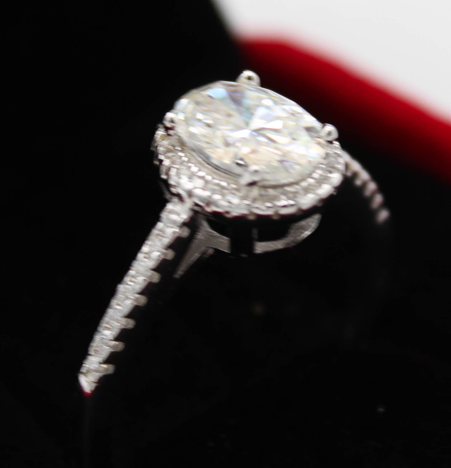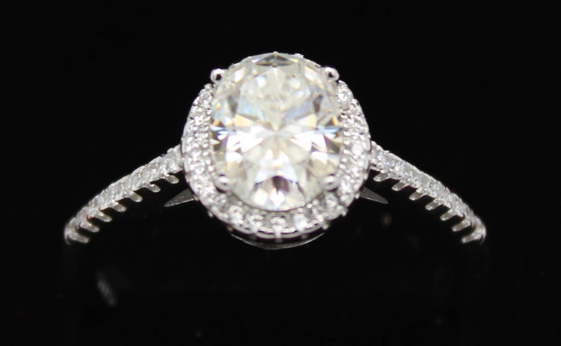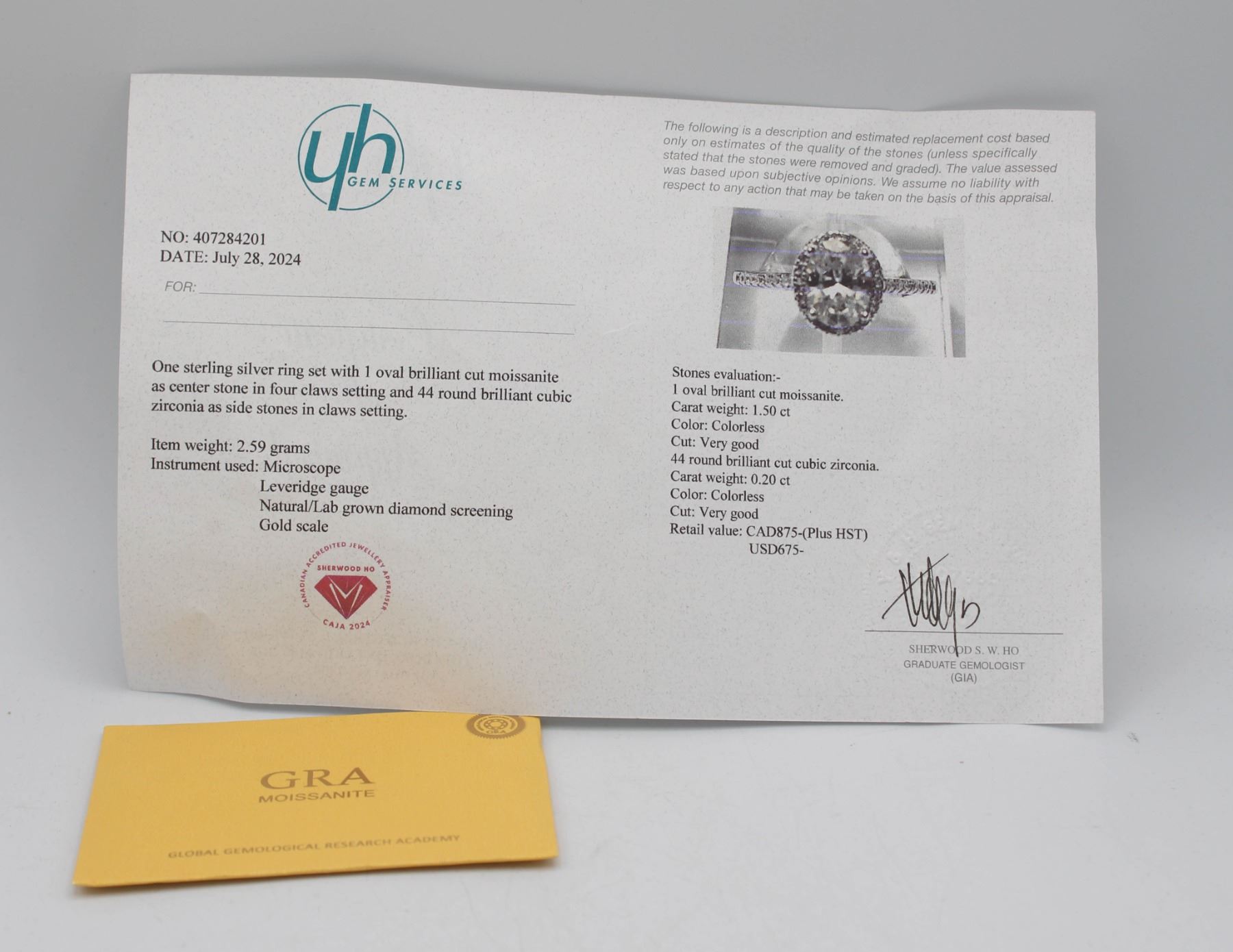 CUT MOISSANITE STONE VVS D COLOR WITH 44 ROUND BRILLIANT CUT CUBIC ZIRCONIA SET IN SQUARE SHAPED HALO WITH MORE SET IN THE SHANK SET IN 925 SILVER RING SIZE 7.5 RETAIL VALUE $875.00