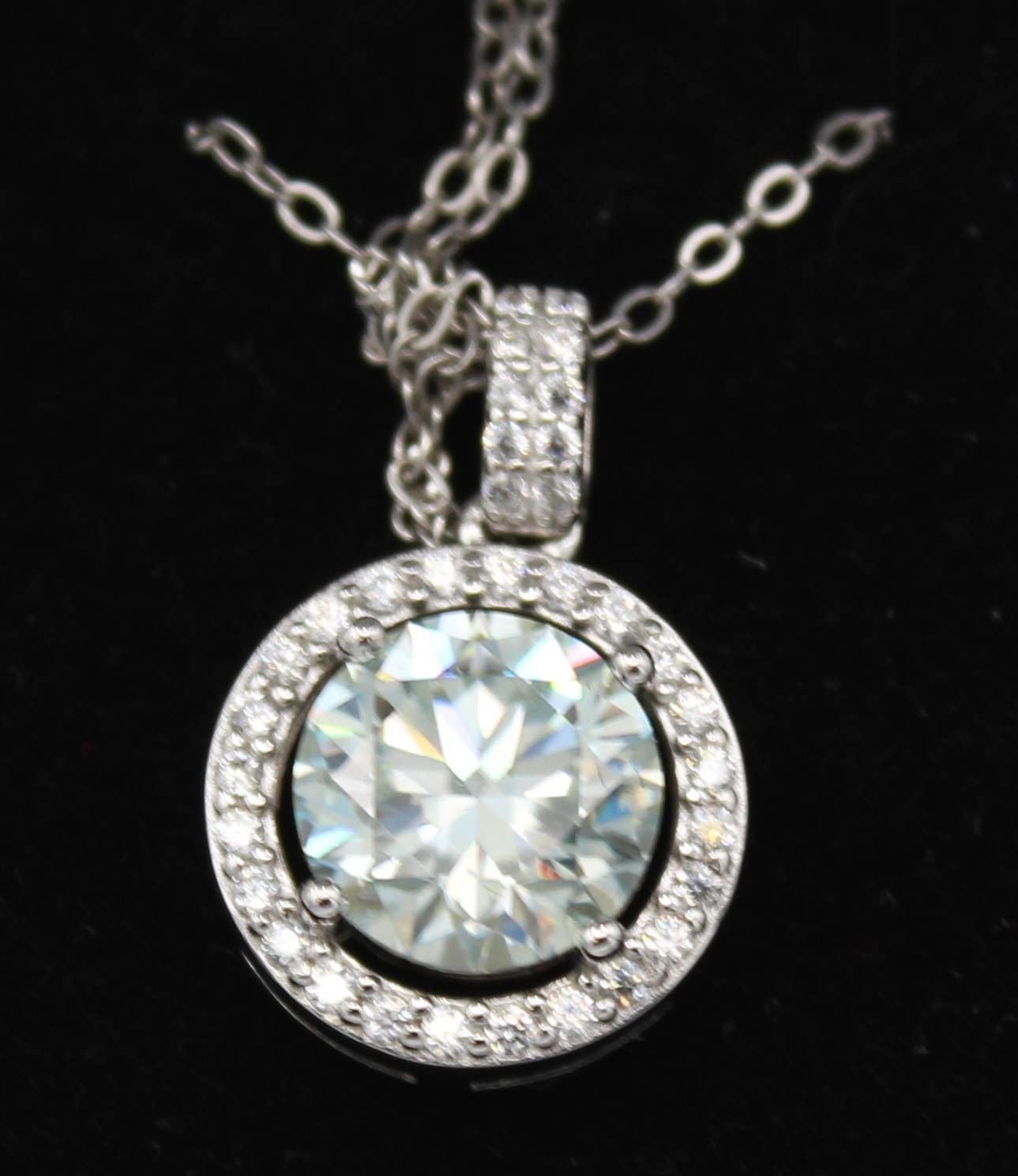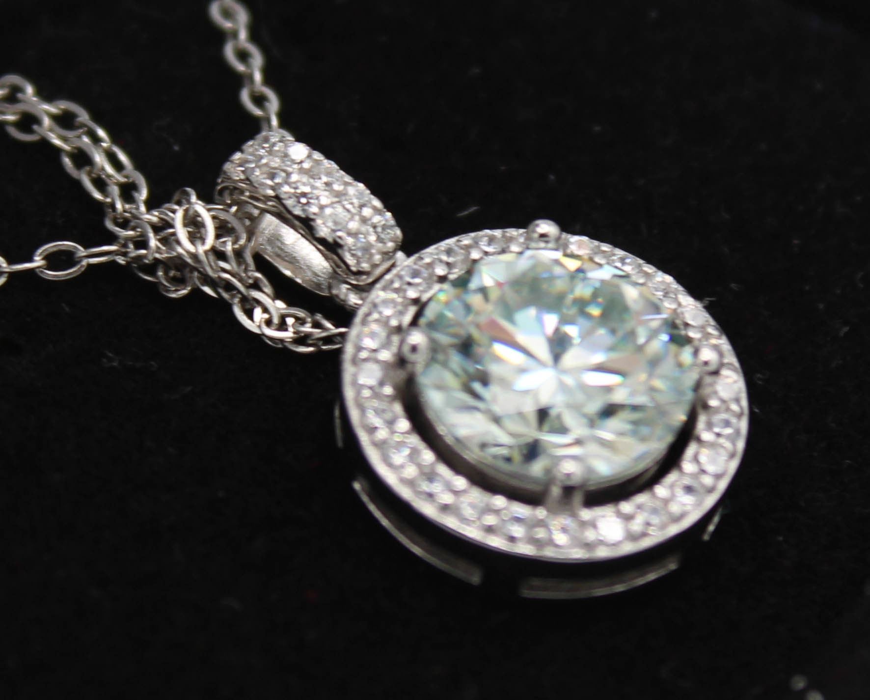 ROUND BRILLIANT CUT MOISSANITE STONE VVS D WITH 34 ROUND BRILLIANT CUT CUBIC ZIRCONIA SET IN ROUND HALO WITH MORE IN BALE SET IN 925 SILVER PENDANT