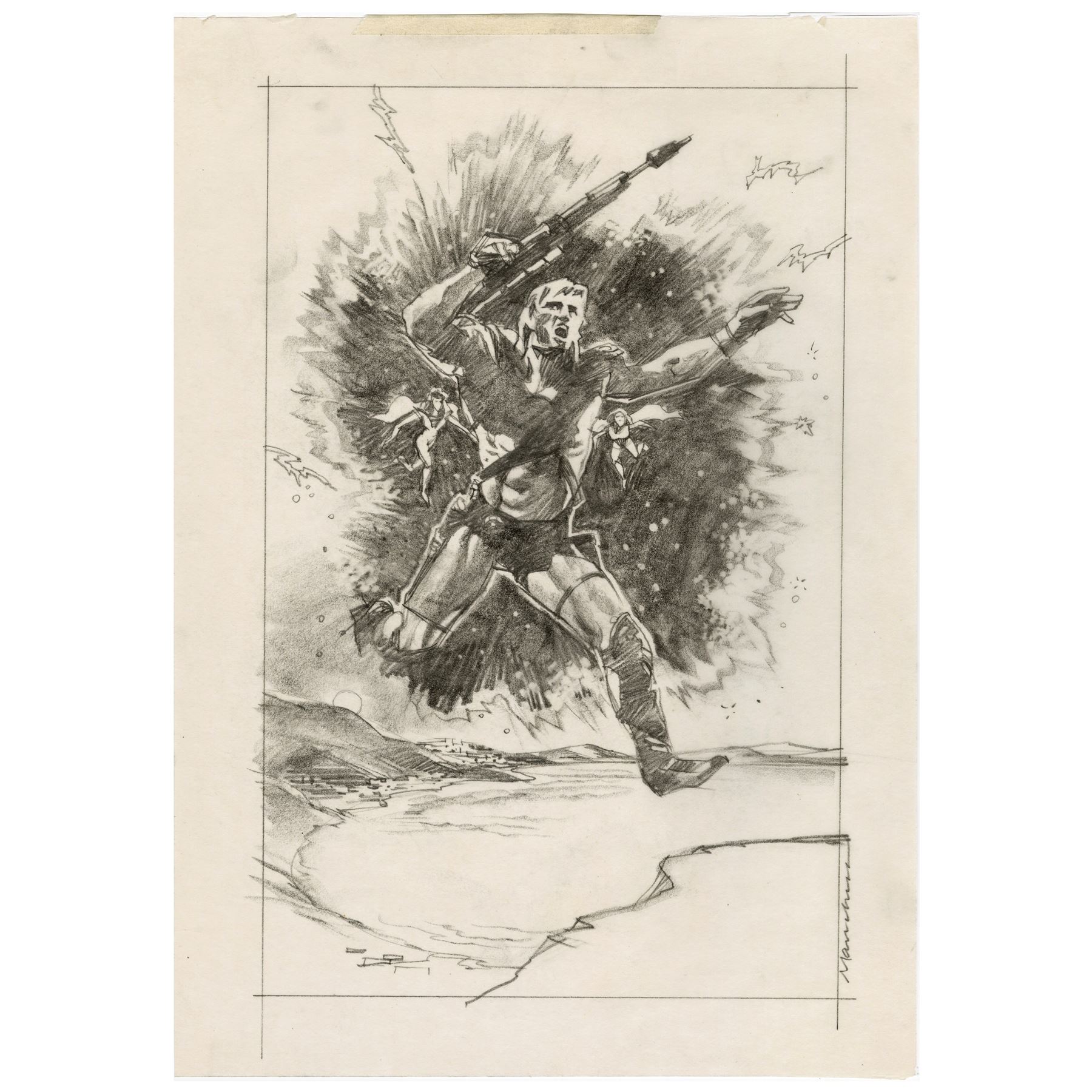 This sketch depicting He-Man (Dolph Lundgren) acquiring the Power of Grayskull is rendered in graphite on illustration paper and signed by Manchess along the right border. Its edges are cut unevenly and its top edge is applied with tape. Dimensions: 8" x 11.75" (20.5 cm x 30 cm)