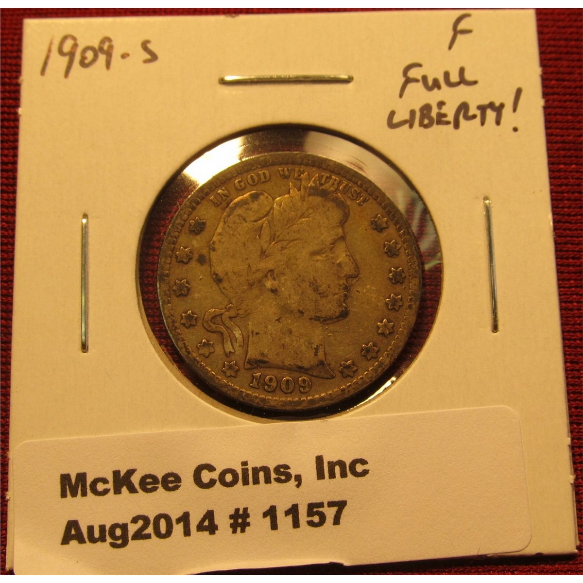 1157. 1909-S Barber Quarter F, full LIBERTY!