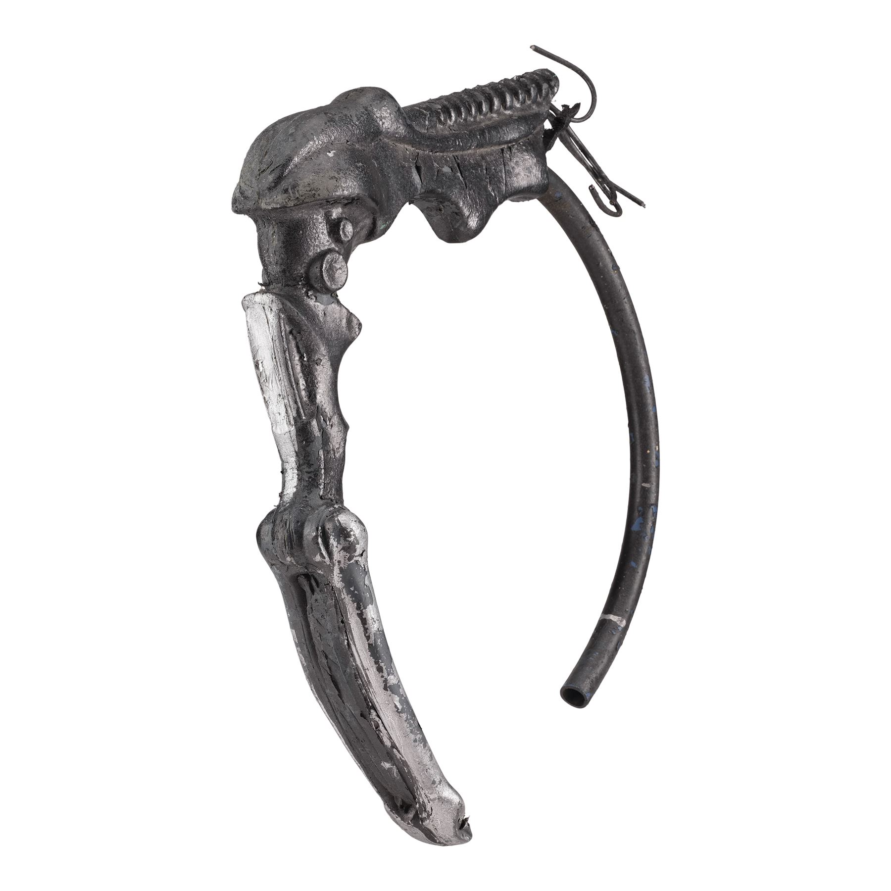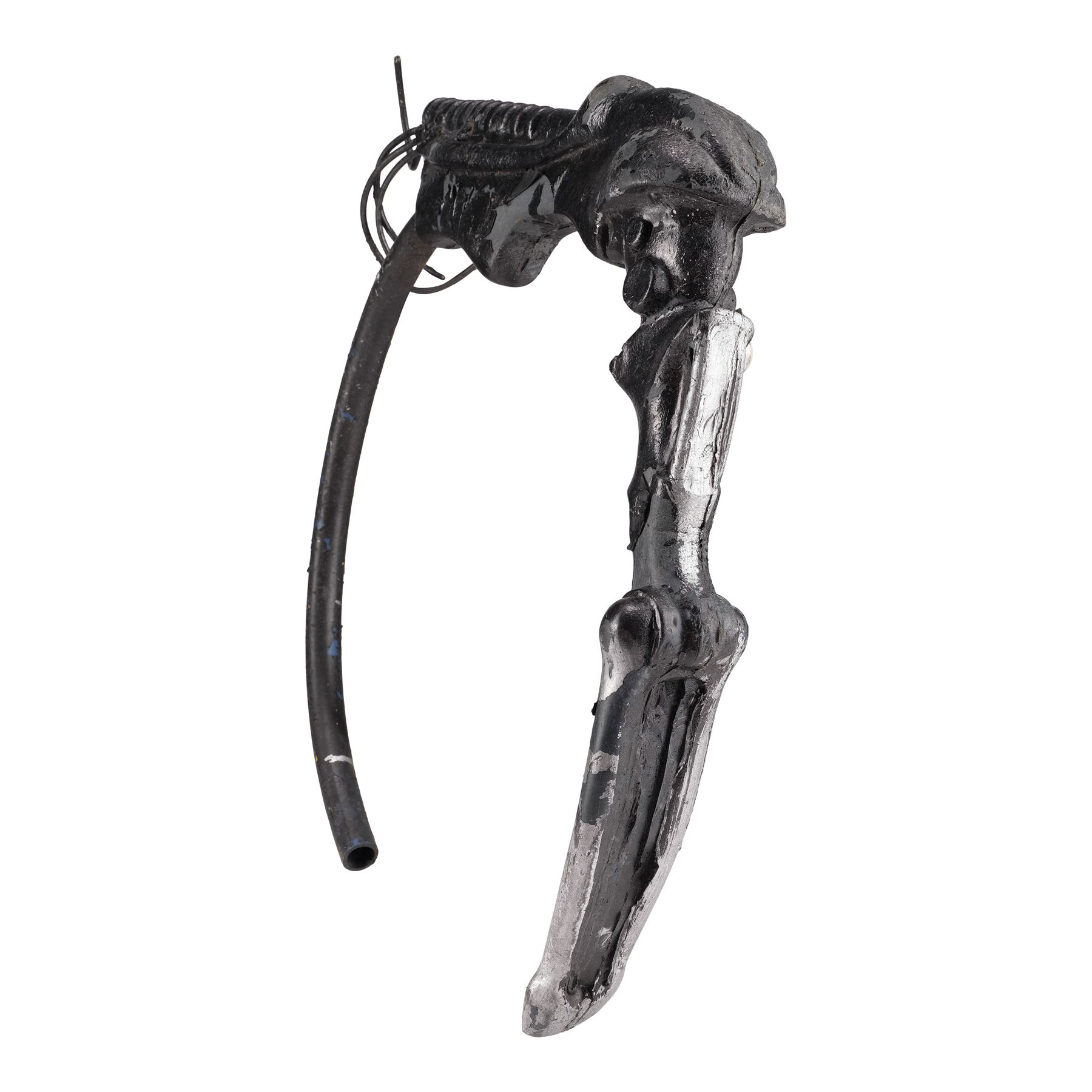 This futuristic, biomechanical, static foam rubber sentinel arm is painted black and silver-color to appear metallic with a single pointed finger on one end and spiny ridges along its shoulder.