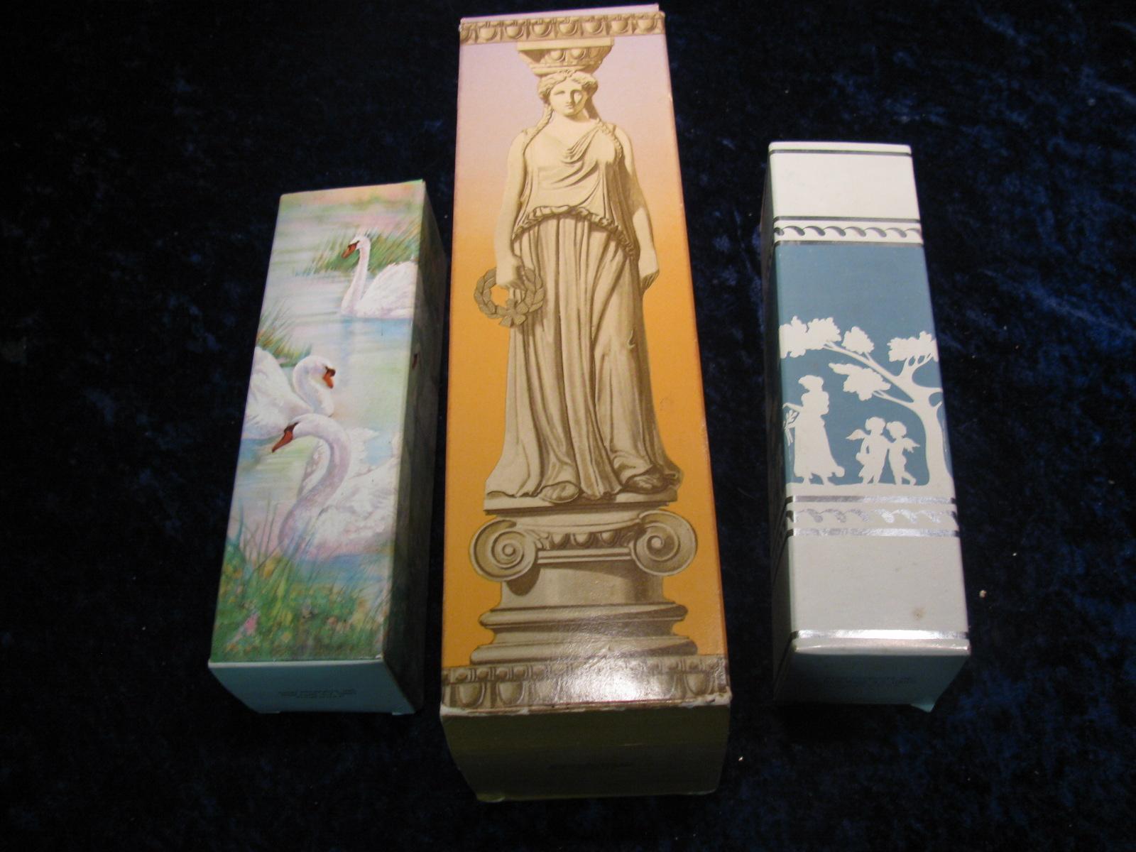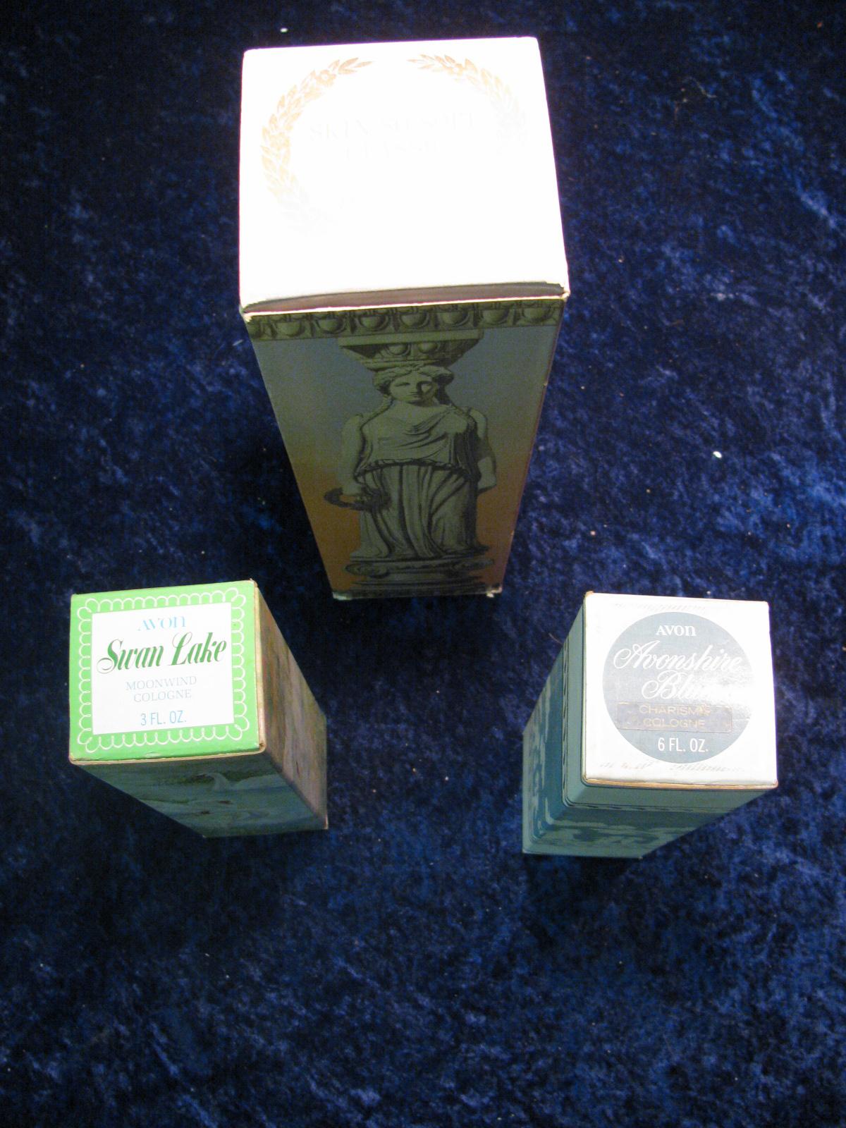 1158. Avon Skin So Soft, Swan Lake, Avonshire Blue Decanter Bottles. Still Fule of their cologne and
