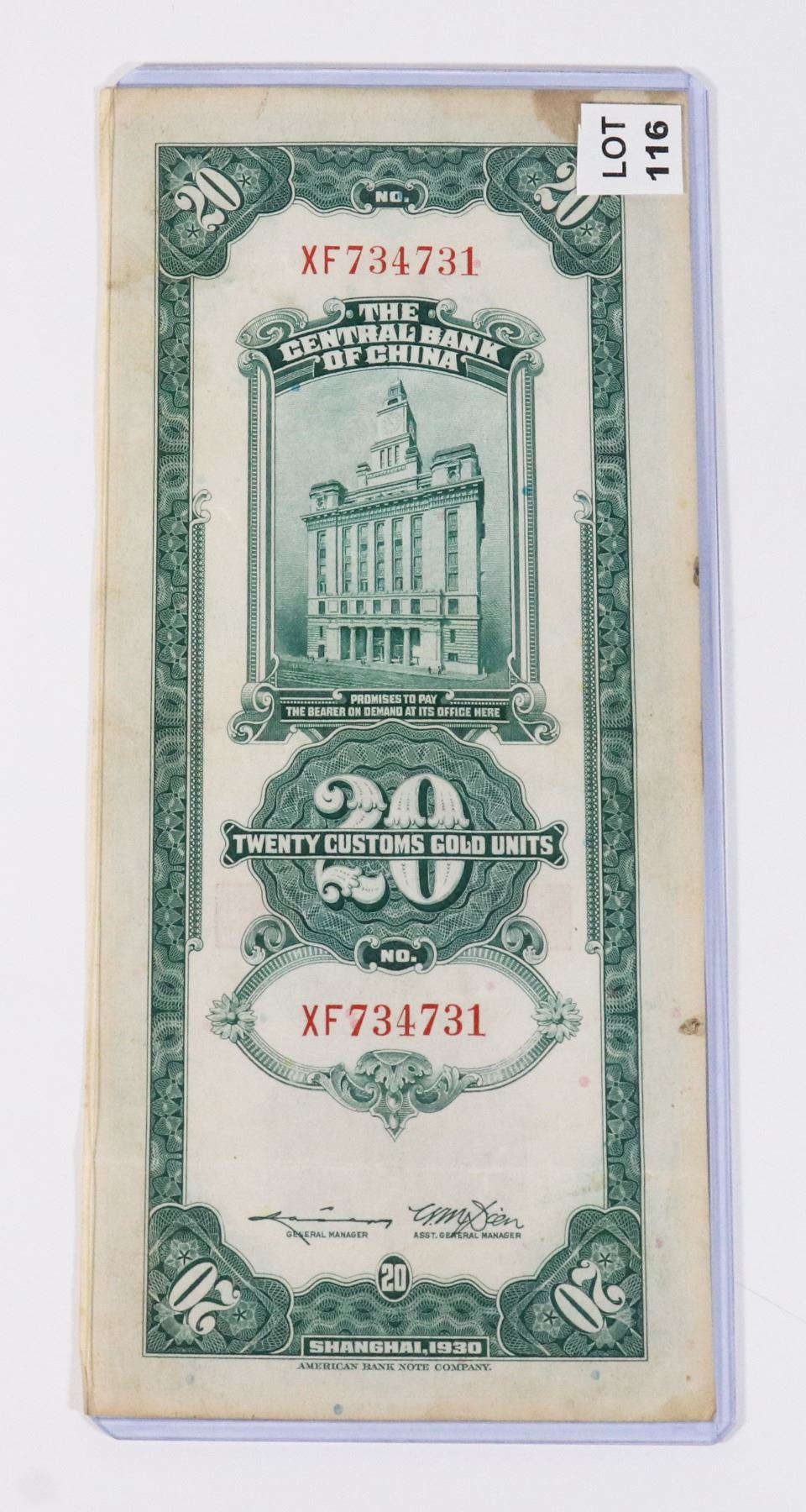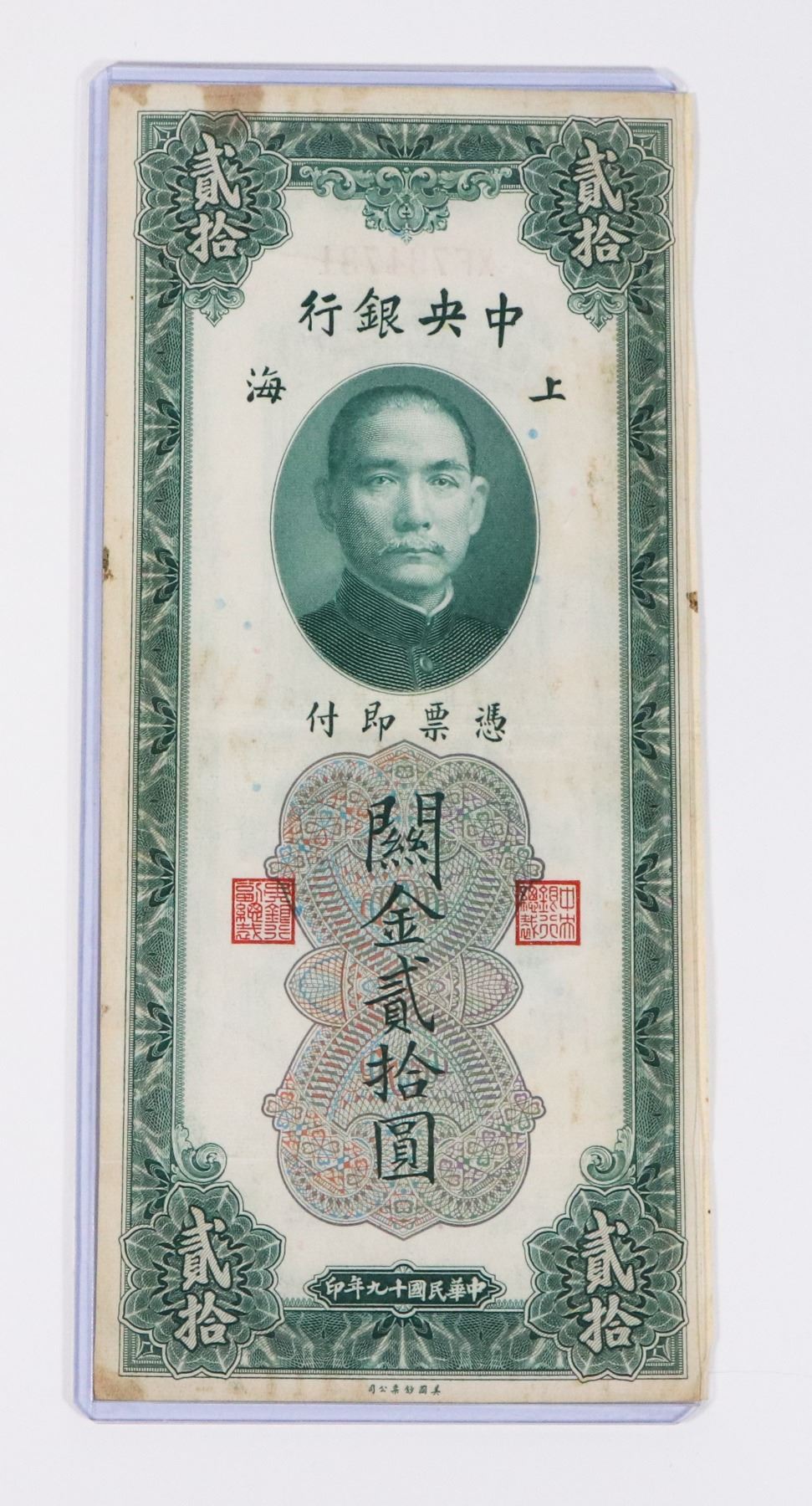 SHANGAIN 1930 AMERICAN BANK NOTE COMPANY TWENTY CUSTOMS GOLD UNITS CENTRAL BANK OF CHINA PAPER MONEY BILL NOTE BANKNOTE SUN YAT-SEN CHINESE