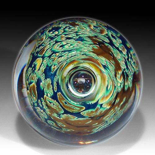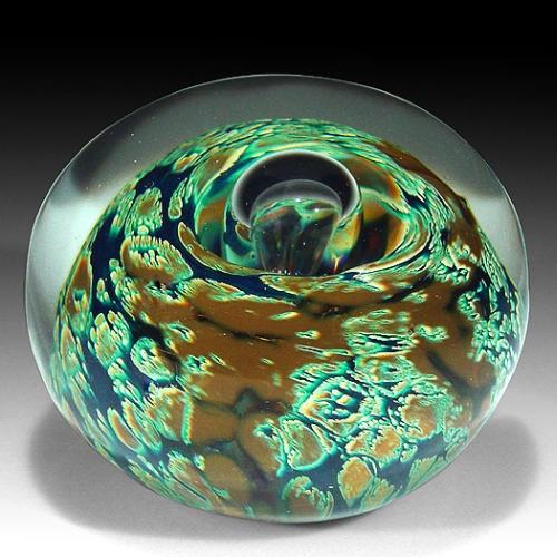 Miscellaneous 1995 abstract design paperweight, containing a large bubble, centered within a blue, brown, and ivory-mottled cushion. Signed/dated (unknown signature "L. TU____"). Diameter 3 1/2". NO RESERVE