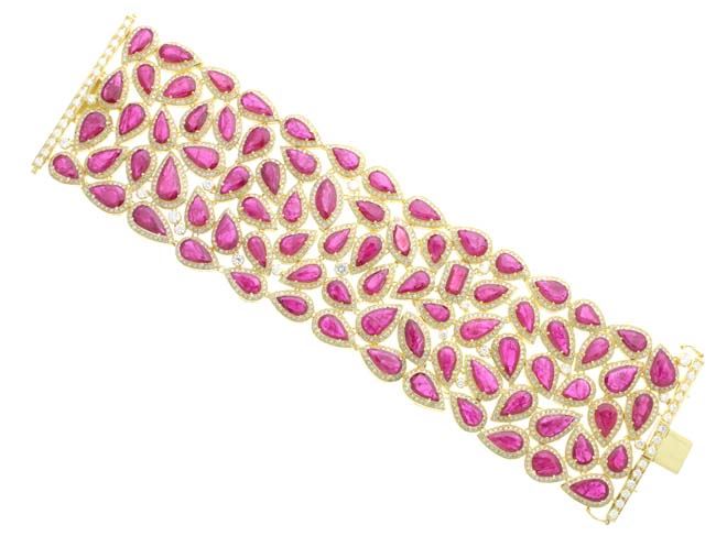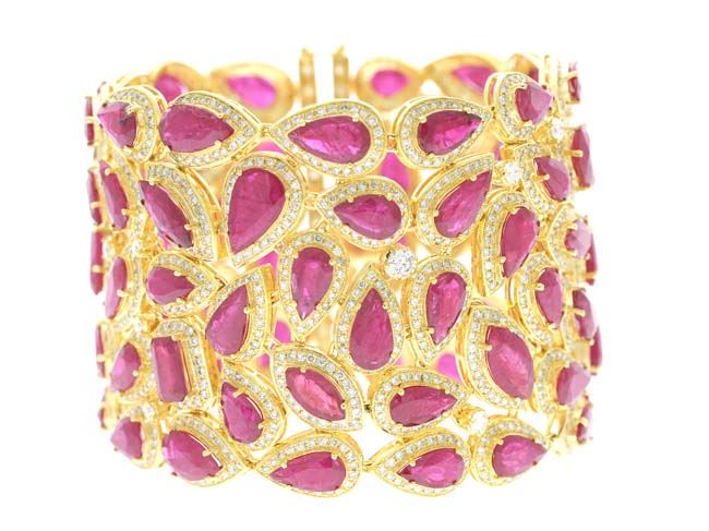 18k Gold RUBY AND DIAMOND BRACELET/Diamond Color & Clarity:G-H/SI1-SI3/Diamond Count 1:1710/Diamond 1 TCW:13.82/Diamond Color & Clarity 2:/Diamond Count 2:/Diamond 2 TCW:/Gemstone Count 1:81/Gemstone TCW 1:102.66/Gemstone Dimension:/Gemstone TCW 2:/Metal Type 1:18k Gold Yellow Gold //Weight Gram:101.01&Weight Gram:/Gross Weight:119.19