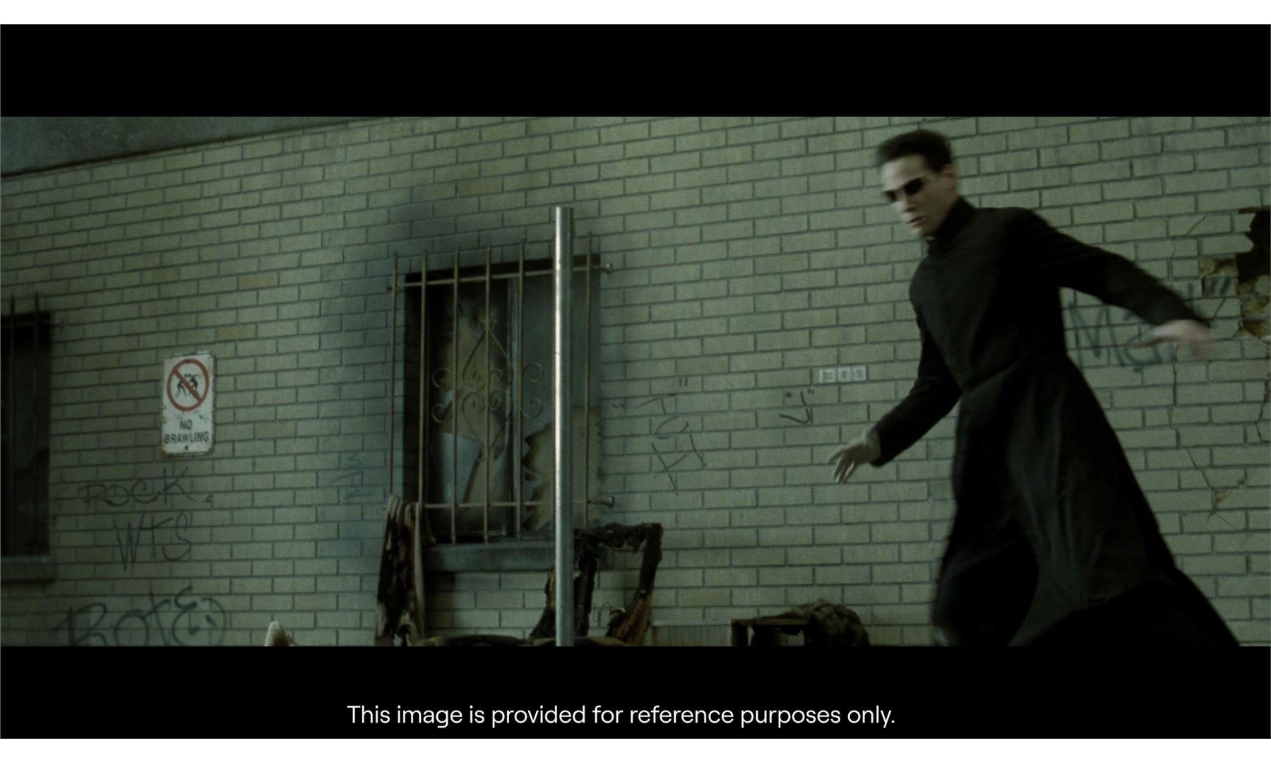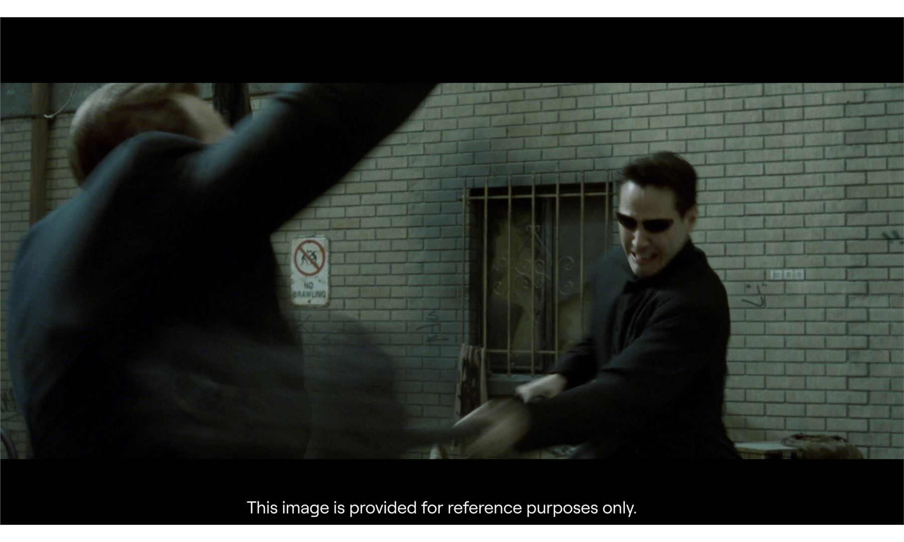 THE MATRIX RELOADED (2003) - "No Brawling" Sign - A "No Brawling" sign from The Wachowskis' The Matrix Reloaded. As Neo (Keanu Reeves) and Smith (Hugo Weaving) began their penultimate battle, a "No Brawling" sign was visible on the wall in the park.