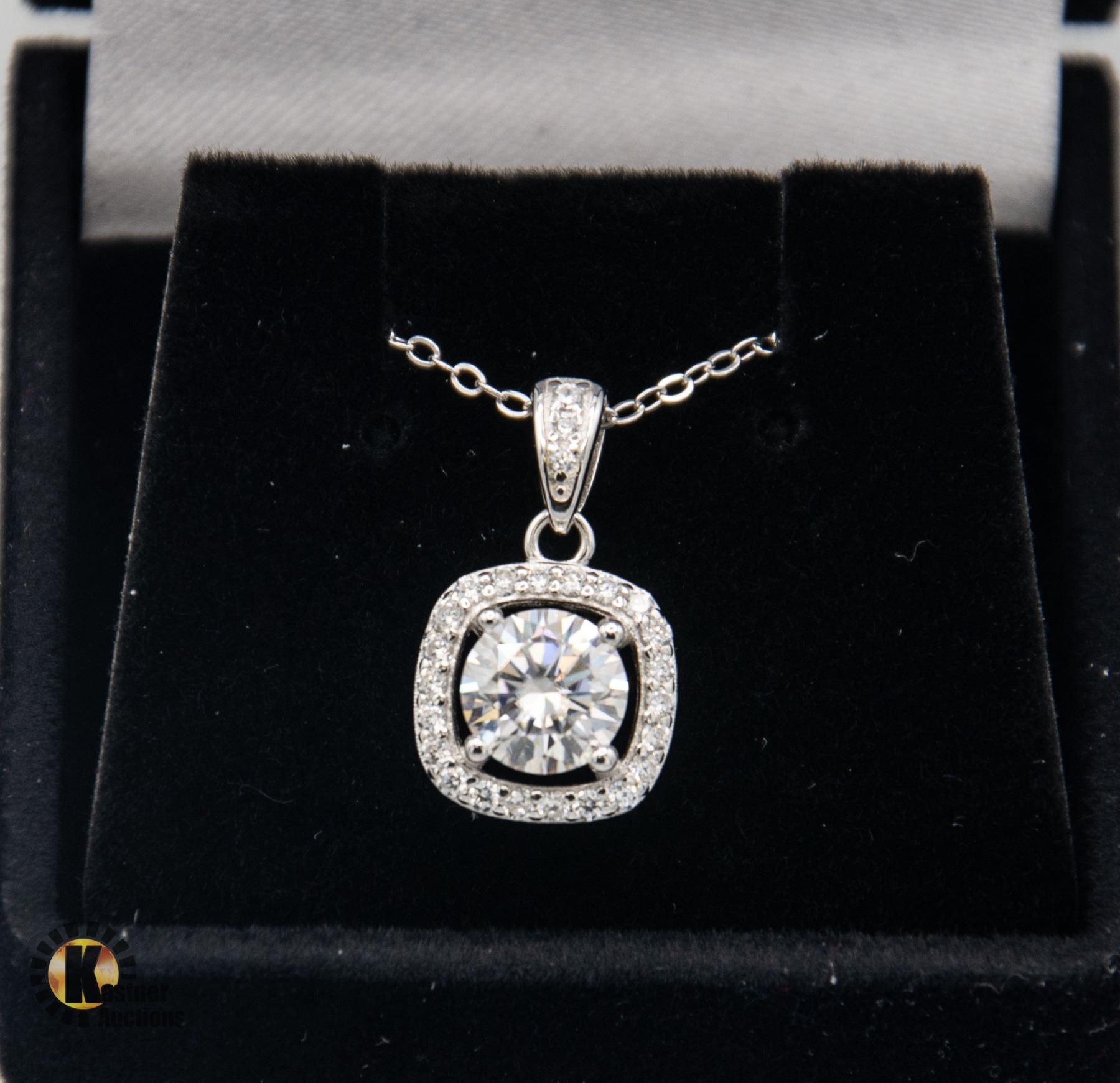 MOISSANITE STONE VVS D COLOR SURROUNDED BY SQUARE HALO SET IN 925 SILVER PENDANT RETAIL VALUE $775.00 **ALL ITEMS MUST BE REMOVED BY 5PM SATURDAY, DECEMBER 14th 2024. ALL REMAINING ITEMS WILL BE SUBJECT TO A $6.00 PER DAY STORAGE CHARGE. ANY ITEMS REMAINING AFTER MONDAY, DECEMBER 30TH 2024 WILL BE CONSIDERED FORFEITED. NO REFUNDS WILL BE ISSUED FOR FORFEITED ITEMS. TO SCHEDULE A PICK UP APPOINTMENT CLICK HERE