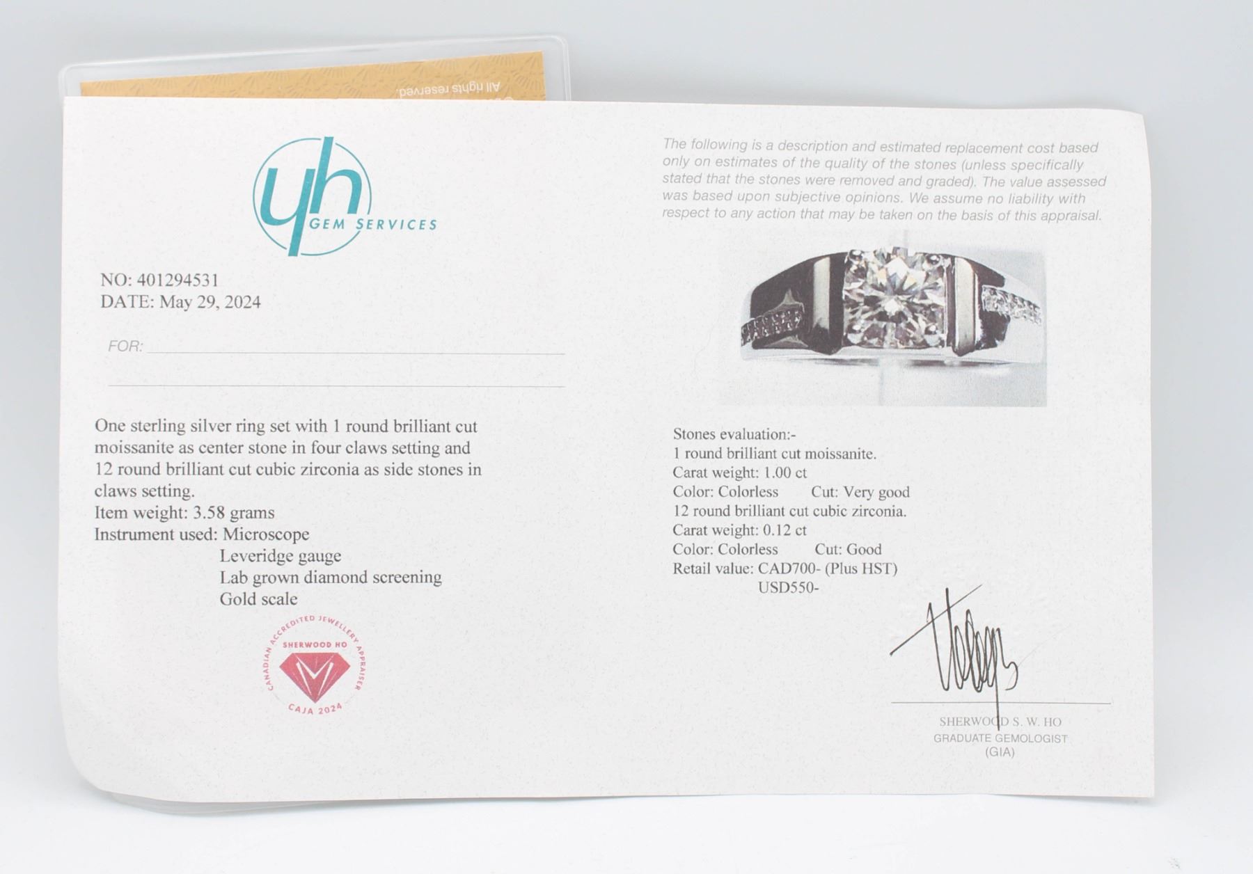 CUT MOISSANITE VVS D COLOR SET IN CENTER WITH 12 ROUND CUT CUBIC ZIRCONIA SET ON SHANKS SET IN 925 SILVER RING SIZE ADJUSTABLE RETAIL VALUE $700.00
