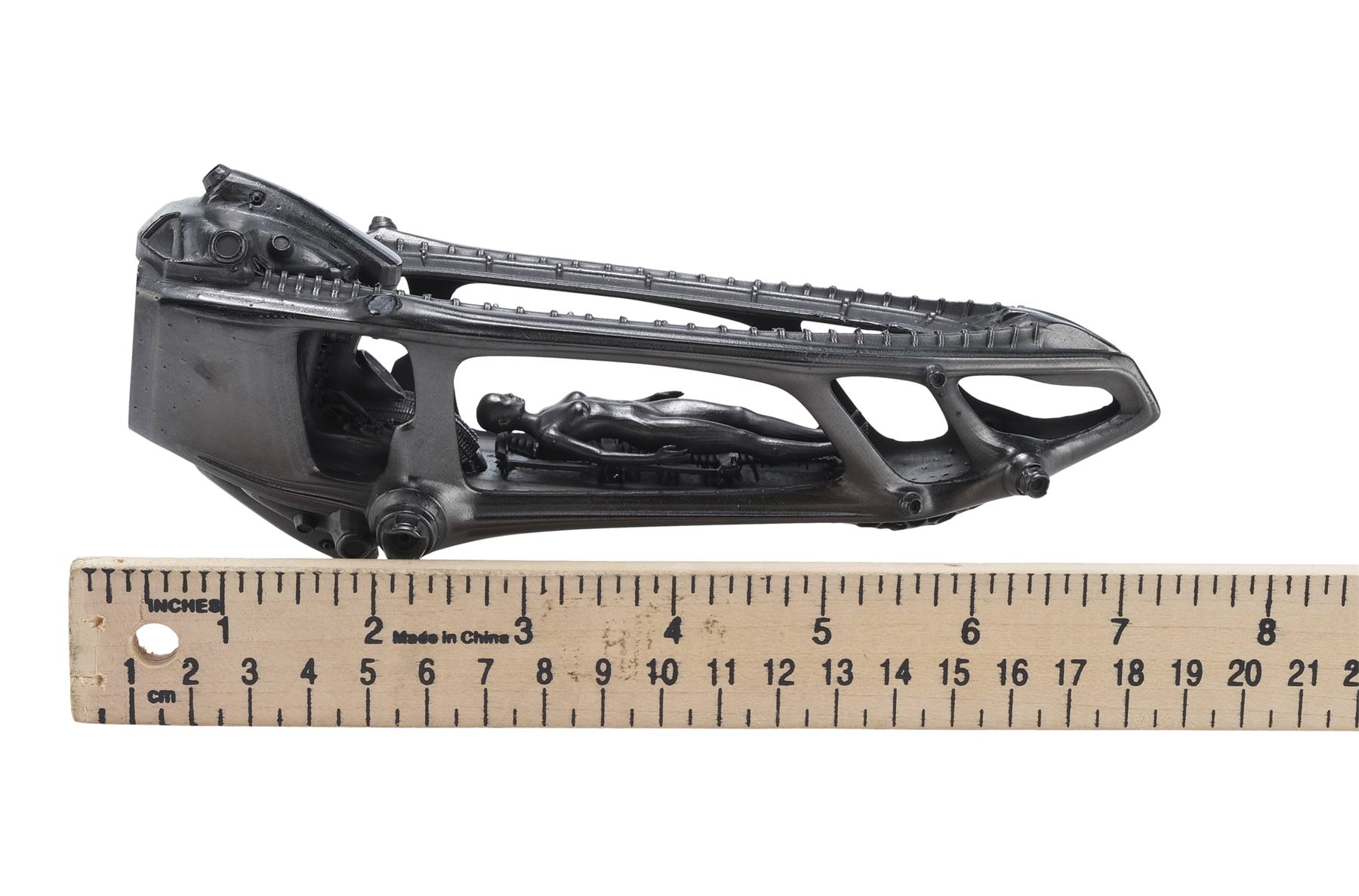This crew gift consists of a black 3D-printed pod chamber model with a feminine human figure inside, attached to a clear acrylic display stand. The 3D-print exhibits some minor imperfections in the print and the acrylic exhibits minor scratching. Dimensions: 7.5" x 2.5" x 3.5" (19.25 cm x 6.5 cm x 9 cm)