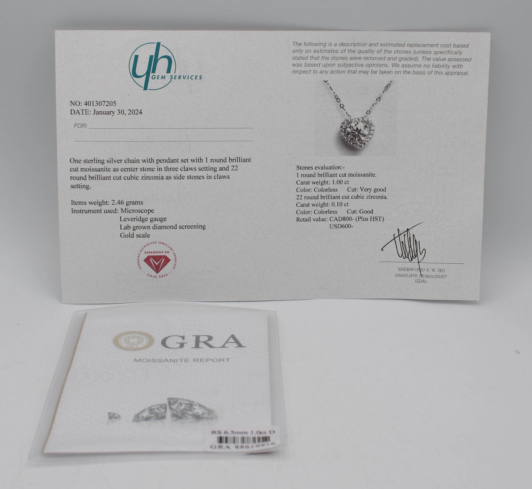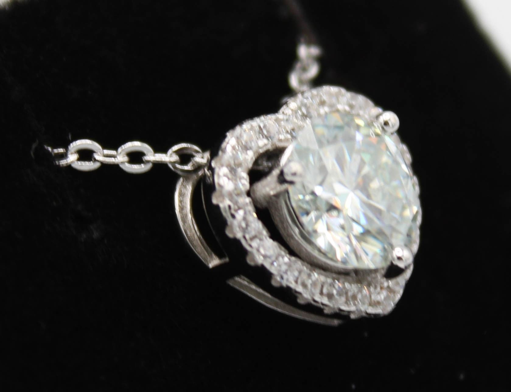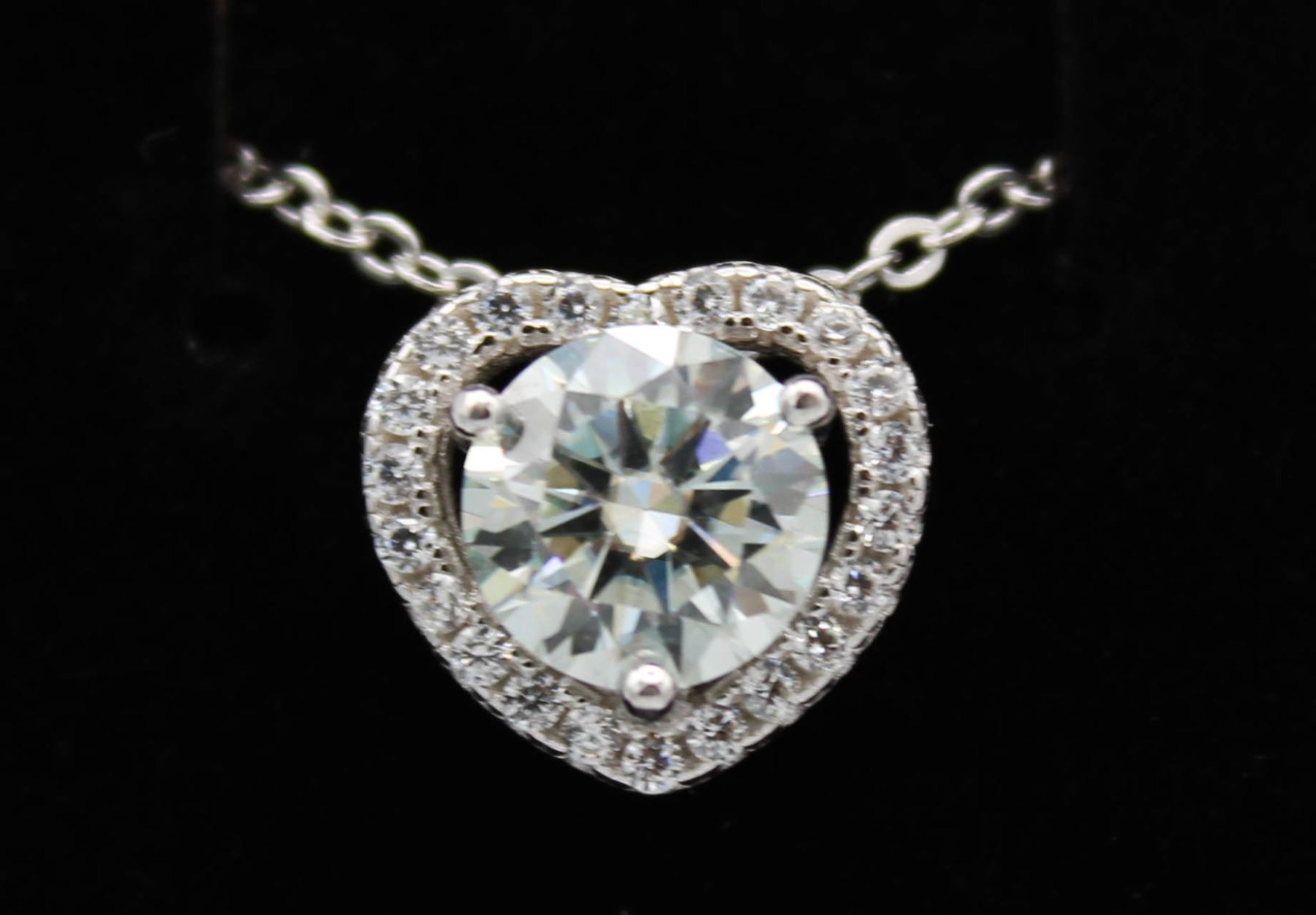 CUT MOISSANITE VVS D COLOR SET IN CENTER WITH 22 ROUND CUT CUBIC ZIRCONIA SET IN HEART SHAPED HALO SET IN 925 SILVER PENDANT RETAIL VALUE $800.00