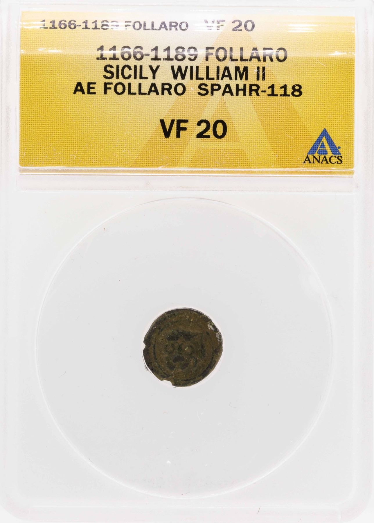 One 1166-1189 Sicily William II Ae Follaro Coin ANACS VF20.