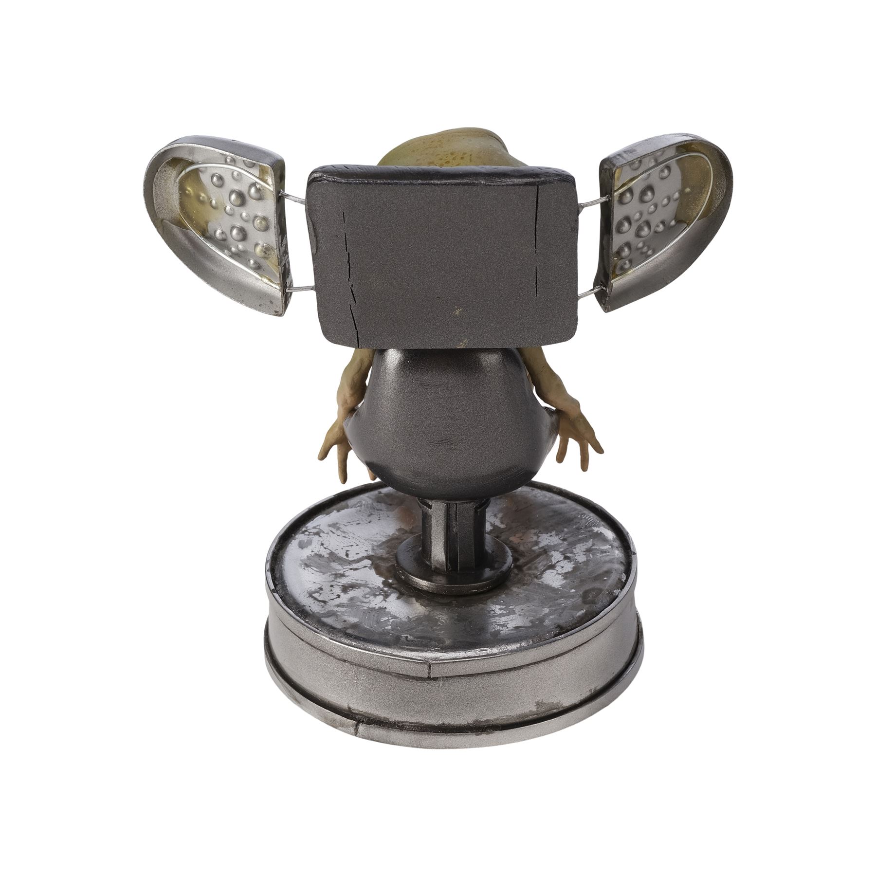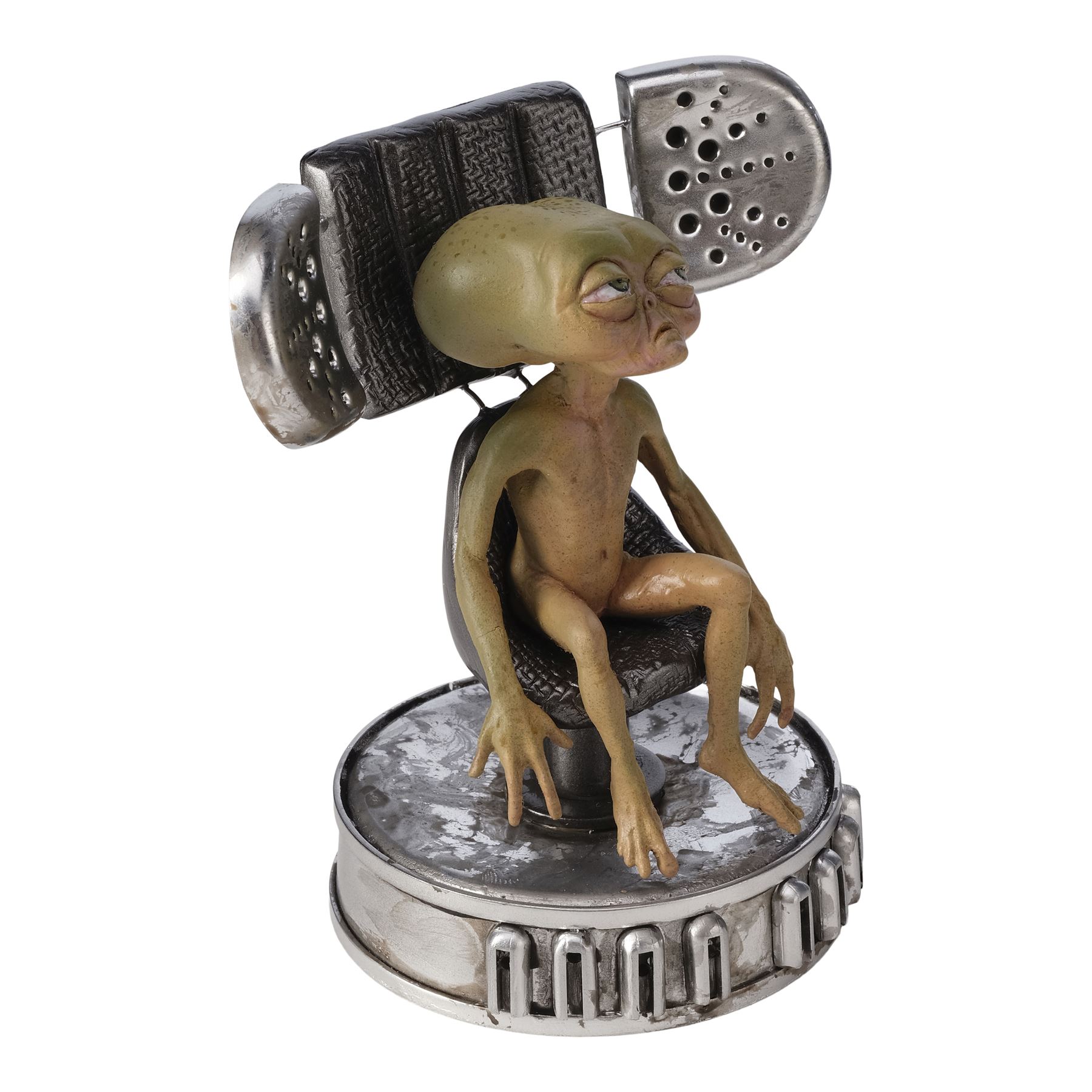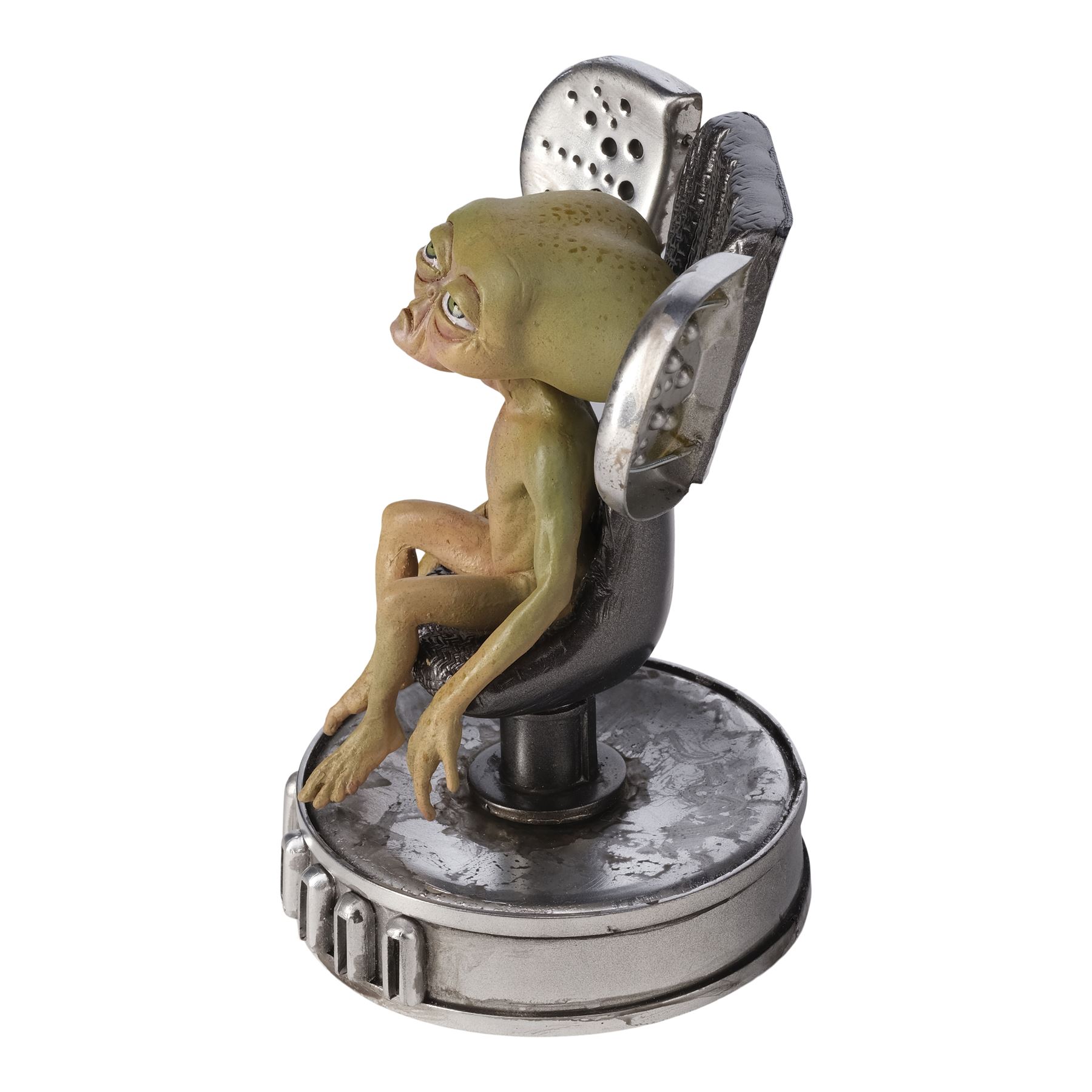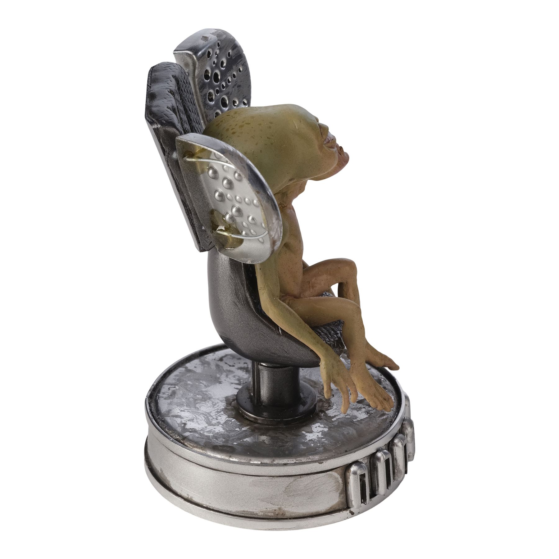 This production-made, ornately detailed clay reference maquette is hand-painted green and tan with large green eyes and a spotted head. The maquette was originally a raw casting that was later painted by Tom Spina Designs, as well as adding a resin Arquillian chair with chrome-color detailing and a metal-weighted base to complete the look. It exhibits grime and adhesive residue. Dimensions: 4.5" x 4.5" x 5" (11.5 cm x 11.5 cm x 12.75 cm)