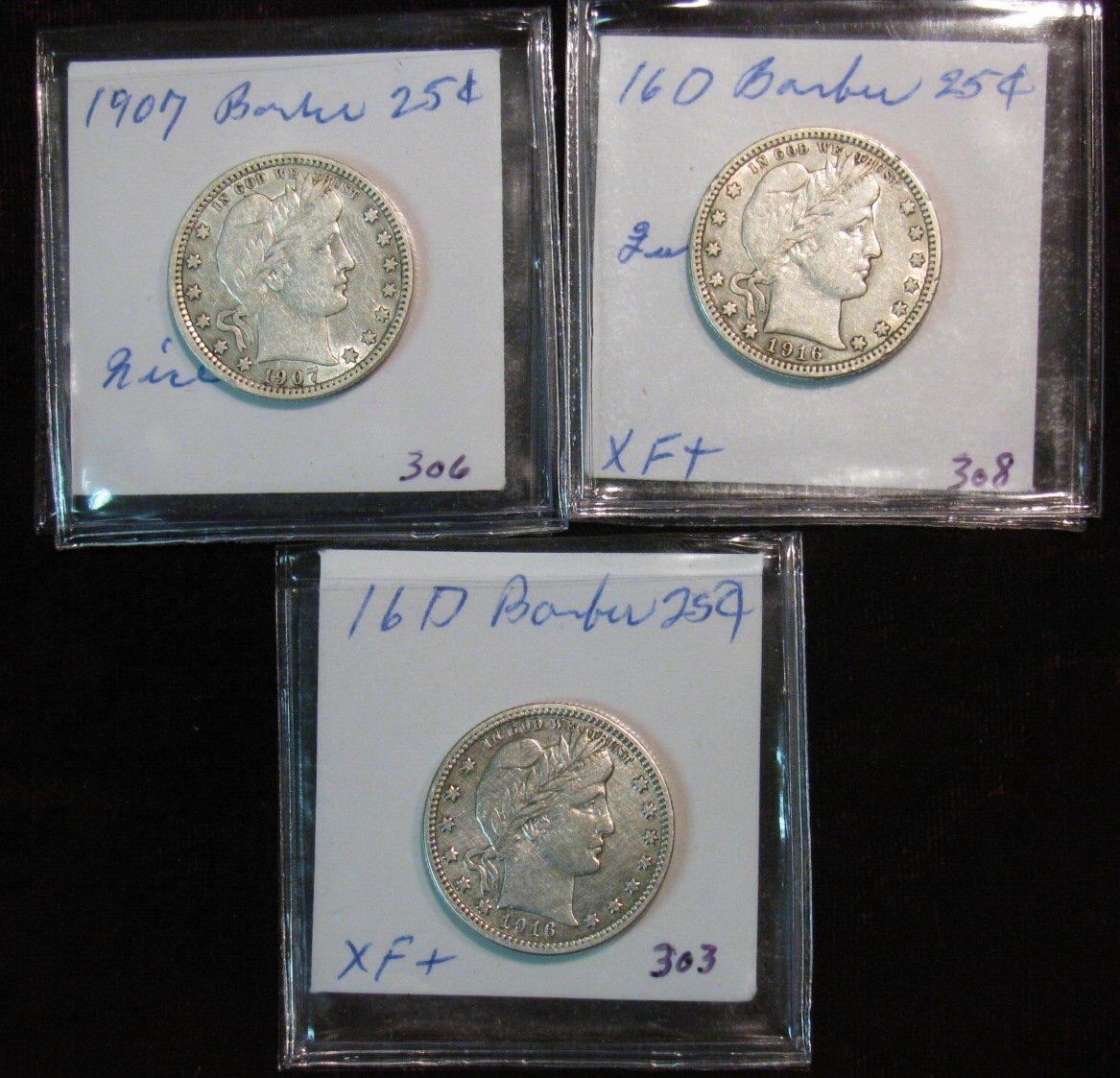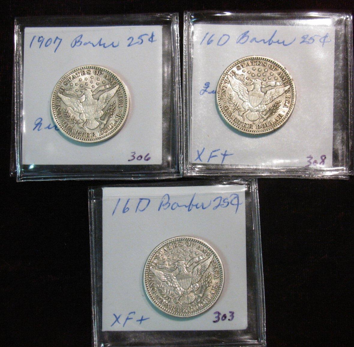 1168. 1907 P & (2) 16D Barber Quarters. VF-EF.