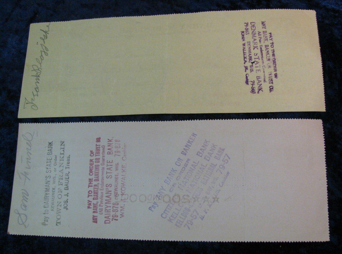 117. Pair 1928-29 Cancelled Checks "Harry W. Benecke" Denmark State Bank & Badger State Banks. Superb lithographs on these 80 year old checks.