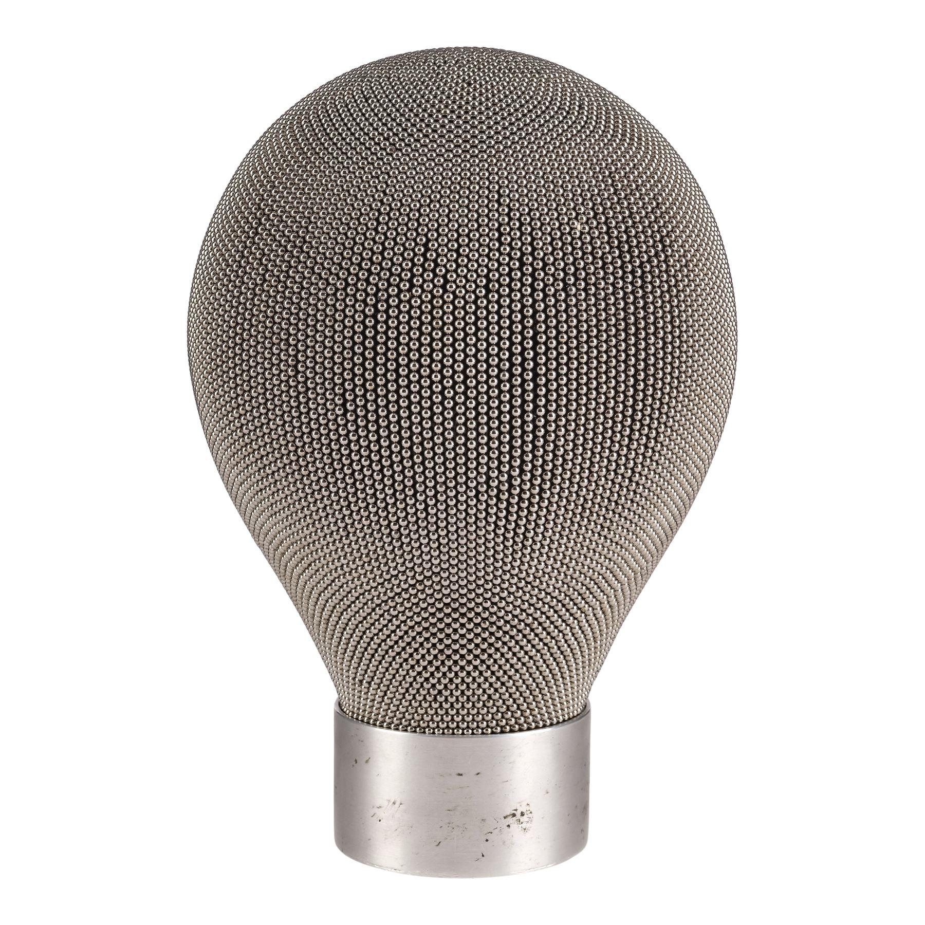 This padded mask-making mannequin head features a beaded metal cover and a machined aluminum base mounted at the bottom. The base exhibits scratching and discoloration from being affixed to a larger machine unit. Dimensions: 6.5" x 6.5" x 11" (16.5 cm x 16.5 cm x 28 cm)