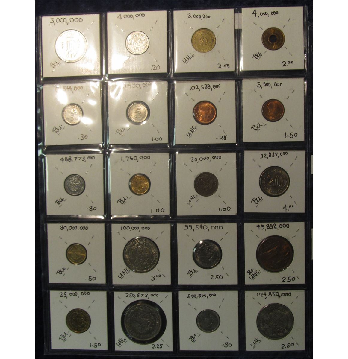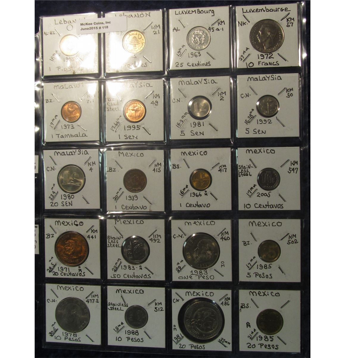 118. (20) World Coins in a Plastic Page identified with KM No., Metal size, & etc. All different. Includes: Lebanon, Luxembourg, Malawi, Mexico, & Malaysia . KM Value on this group is $29.60.